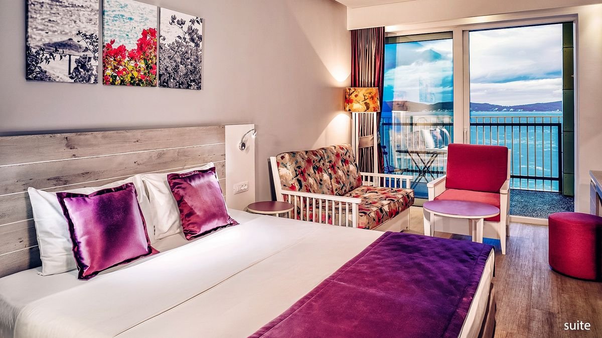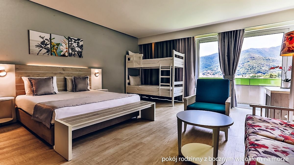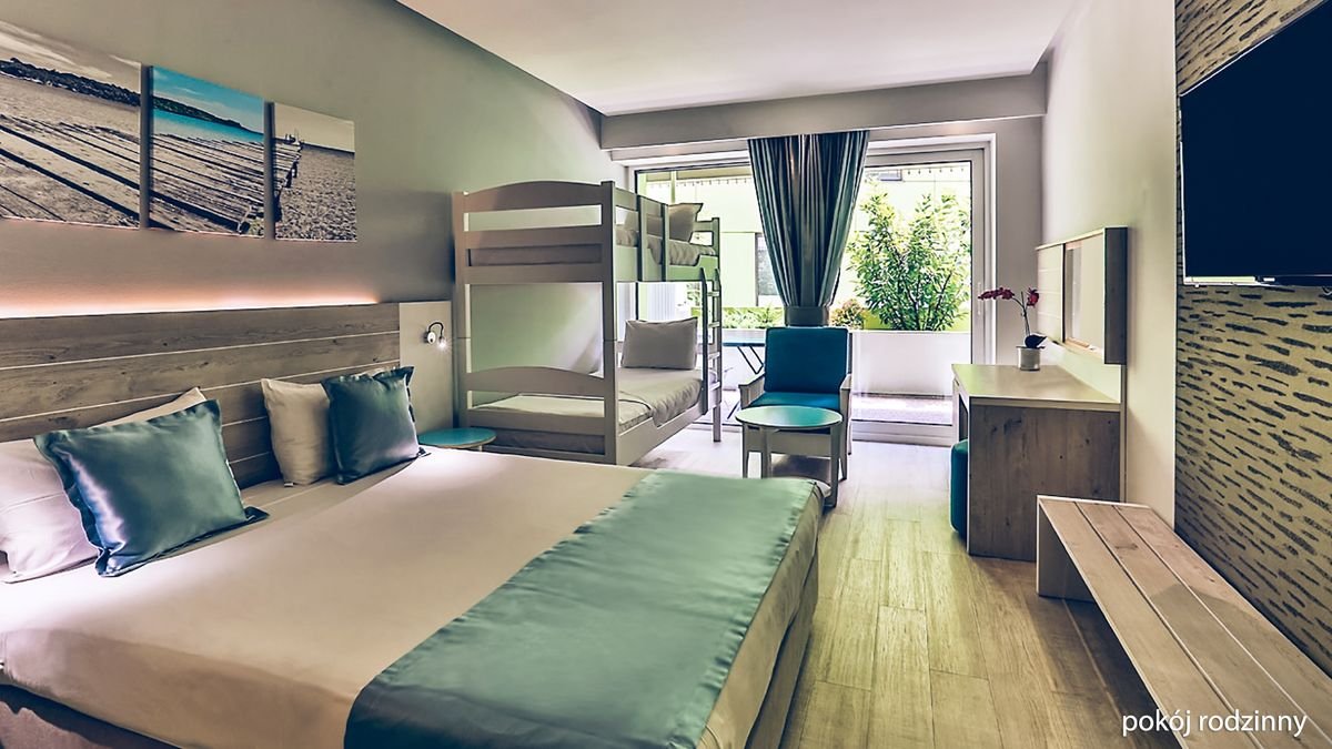 standardowy: 2-os. (możliwość 1 dostawki tylko w pokojach z bocznym widokiem na morze i widokiem na morze), ok. 22-28 m², klimatyzowany, łazienka (prysznic, wc; suszarka), internet bezprzewodowy, telewizja satelitarna, telefon; za opłatą: sejf, minibar; bezpłatne łóżeczko dla dziecka do 2 lat na zamówienie przed przyjazdem; balkon (stolik i krzesełka), widok na góry; boczny widok na morze i widok na morze za dopłatą; rodzinny: 2-os. (możliwość 1 lub 2 dostawek dla dzieci – łóżko piętrowe), ok. 28 m², wyposażenie jak w pokoju standardowym; balkon (stolik i krzesełka), widok na miasto; rodzinny z bocznym widokiem na morze: 2-os. (możliwość 4 dostawek dla dzieci – łóżko piętrowe i sofa), ok. 43-46 m², wyposażenie jak w pokoju standardowym; balkon (stolik i krzesełka); suite: 2-os. (możliwość 2 dostawek dla dzieci), ok. 55-58 m², wyposażenie jak w pokoju standardowym; balkon (stolik i krzesełka), boczny widok na morze; widok na morze za dopłatą; pokoje: rodzinny, rodzinny z bocznym widokiem na morze i suite za dopłatą.