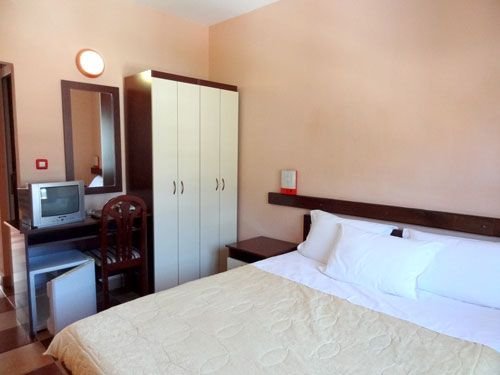 POKÓJ: standardowy: 2-os. (możliwość 1 lub 2 dostawek dla dzieci – sofa), ok. 20-25 m², zadbany, klimatyzowany (w terminie: 15.06-15.09), łazienka (wanna lub prysznic, wc), telewizor; bezpłatne łóżeczko dla dziecka do 2 lat na zmówienie przed przyjazdem; pokój z balkonem na zamówienie, za dopłatą.