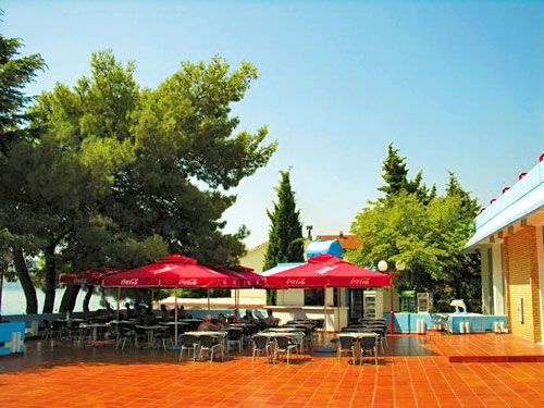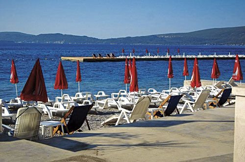 PLAŻA: publiczna, wydzielona część dla gości hotelu, żwirkowo-kamienista, kamieniste zejście do wody, częściowo betonowa platforma, zejście do wody po drabince, zalecane obuwie ochronne, przy hotelu, przejście przez promenadę, parasole i leżaki płatne (ok. 10 EUR/komplet), ręczniki za kaucją.