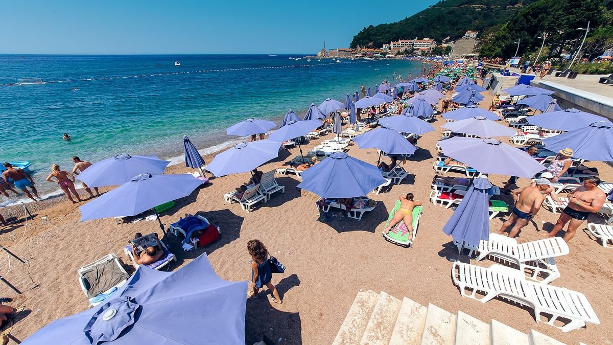 Petrovac, publiczna, piaszczysto-żwirowa, ok. 600 m długości, ok. 80 m od hotelu, przejście przez drogę, parasole i leżaki płatne.