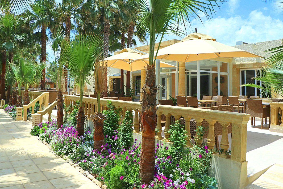 śniadanie (6.30-10.00), obiad (12.30-14.30), kolacja (19.30-21.30) w formie bufetu w restauracji głównej, późne śniadanie w barze głównym (10.00-11.00); przekąski słodkie i słone w restauracji Snack (16.00-17.00); napoje bezalkoholowe: gazowane woda, soki i lokalne napoje alkoholowe: piwo, wino, likiery, koktajle, likier daktylowy - Thibarine, muscat w barze głównym (10.00-23.00), kawa i herbata w Cafe Maure (15.00-23.00).