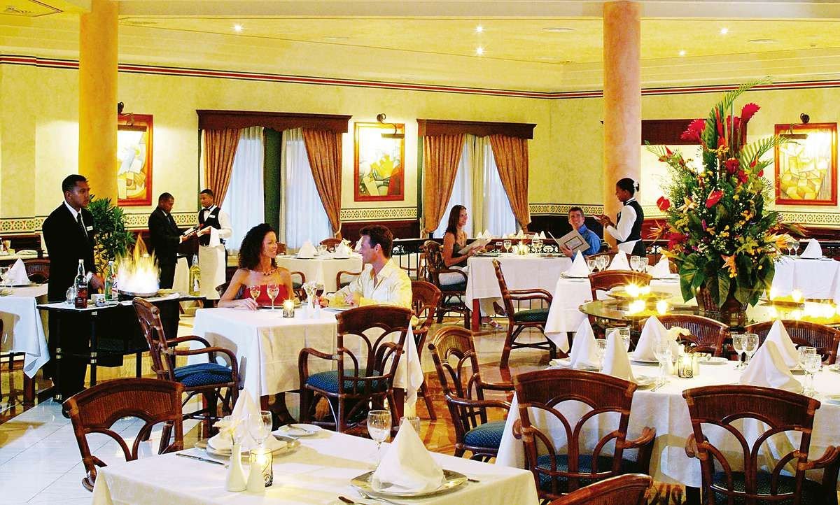 śniadanie (7.00-10.30), obiad (13.00-15.00), kolacja (18.30-22.00) w formie bufetu w restauracji Las Dalias oraz kolacja w restauracji à la carte (3 razy w tygodniu; wymagana wcześniejsza rezerwacja); przekąski w snack-barze (10.00-18.00); napoje bezalkoholowe w wyznaczonym barze (24h), lokalne napoje alkoholowe w wyznaczonym barze (10.00-24.00); wymagane noszenie opasek all inclusive.