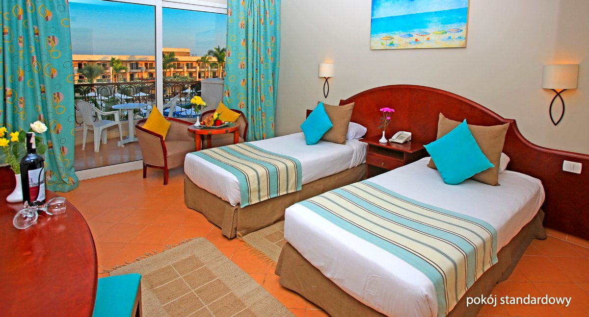 standardowy: 2-os. (możliwość 1 dostawki), ok. 24 m2, indywidualnie sterowana klimatyzacja, łazienka (wanna lub prysznic, wc; suszarka), telewizja satelitarna, polskie programy, telefon, lodówka, zestaw do kawy/herbaty, sejf; za opłatą: minibar (codziennie bezpłatnie butelka wody); bezpłatne łóżeczko dla dziecka do 2 lat na zamówienie przed przyjazdem; widok na basen za dopłatą; rodzinny: 2-os. (możliwość 1 lub 2 dostawek), ok. 30 m2, zadbany, łazienka (wanna, wc; suszarka do włosów); wyposażenie jak w pokoju standardowym; balkon (stolik i krzesełka);