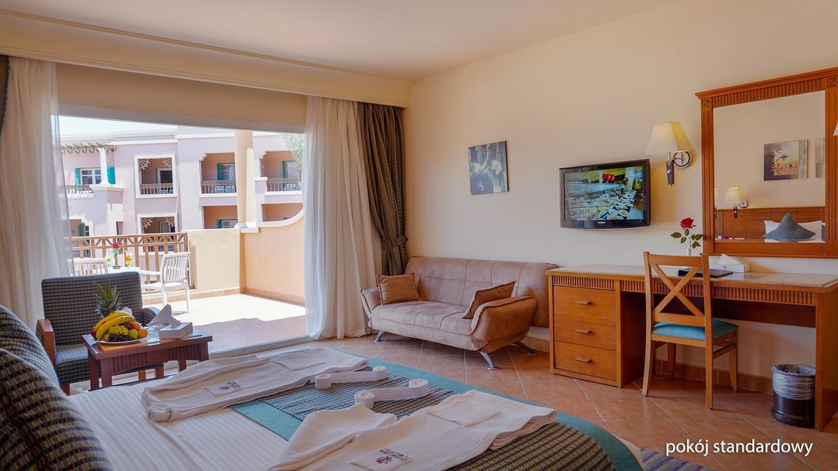 Ładnie wkomponowany w pustynny krajobraz, dokonały na urlop ze znajomymi lub niezapomniane rodzinne wakacje! Do dyspozycji Gości szeroka oferta sportowo-rekreacyjna, możesz pograć w tenisa, siatkówkę albo wziąć udział w animacjach, nie lada gratką jest aquapark ze zjeżdżalniami zarówno dla dorosłych jak i dla dzieci, a jeśli lubisz wolisz odpoczywać z szumem morza w tle, hotelowa plaża znajduje się w odległości krótkiego spaceru – tu każdy znajdzie coś dla siebie! W hotelowych restauracjach czekają smakowite propozycje z kuchni międzynarodowej, indyjskiej i włoskiej, a w barach napijesz się orzeźwiających koktajli i zjesz przekąskę. Dla potrzebujących wyciszenia po wakacyjnych atrakcjach, przestronne, dobrze wyposażone pokoje, odpocznij i naładuj baterie na kolejny dzień wakacyjnych przygód!