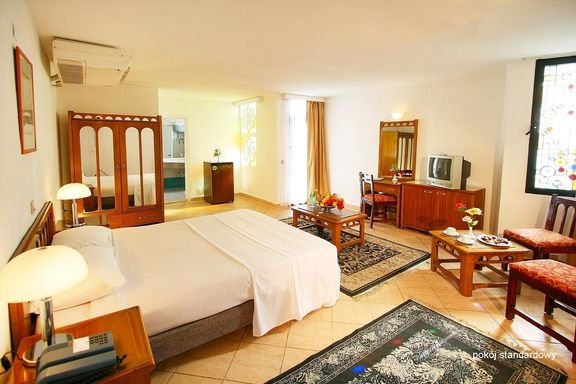 standardowy: 2-os. (możliwość 1 lub 2 dostawek), ok. 34 m², przytulny i wygodnie urządzony, indywidualnie sterowana klimatyzacja, łazienka (prysznic, wc; suszarka), telewizja satelitarna, telefon, minibar (płatny); bezpłatne łóżeczko dla dziecka do 2 lat na zamówienie przed przyjazdem; balkon lub taras (stolik i krzesełka), widok na ogród, widok na basen i morze za dopłatą; rodzinny: 2-os. (możliwość 2 dostawek), ok. 40 m², 2 oddzielne sypialnie, wyposażenie jak w pokoju standardowym; pokój rodzinny za dopłatą.