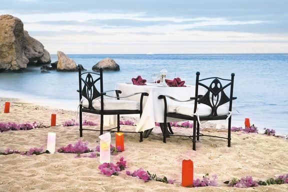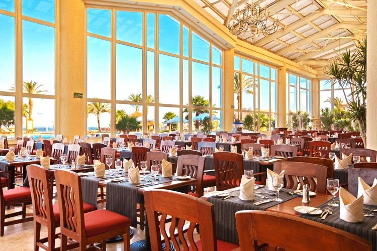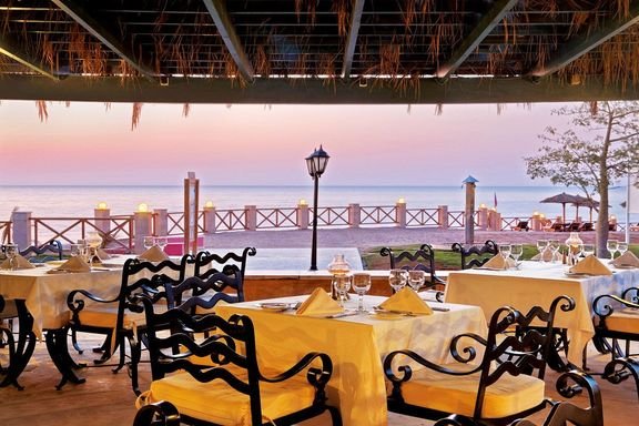 śniadanie (6.30-11.00), obiad (13.00-15.00), kolacja (18.30-22.30) w formie bufetu w restauracji głównej, kolacja w restauracji à la carte Verdi's Bistro i Shish Bish (raz na pobyt; wymagana rezerwacja); przekąski w Paradise Reef (11.00-16.00); lokalne napoje bezalkoholowe i alkoholowe w wyznaczonych barach (10.00-24.00); wymagane noszenie opasek all inclusive.