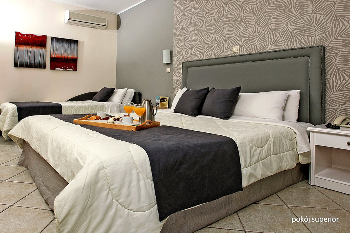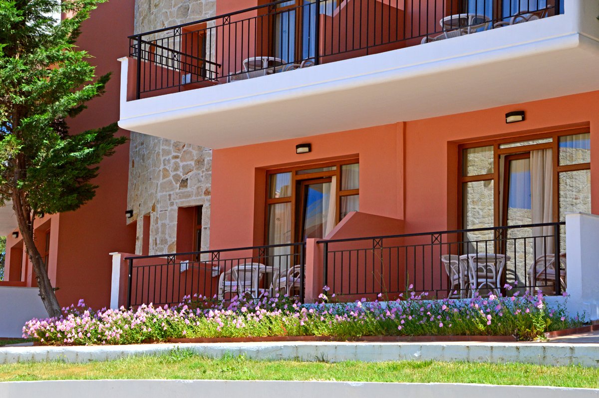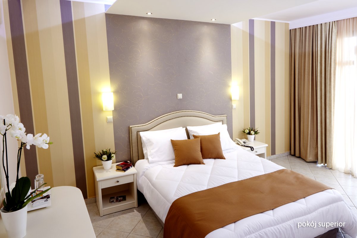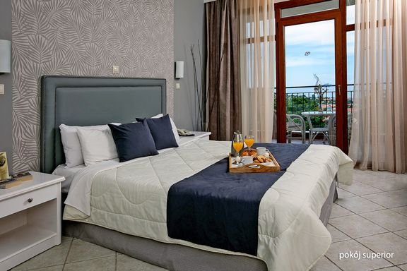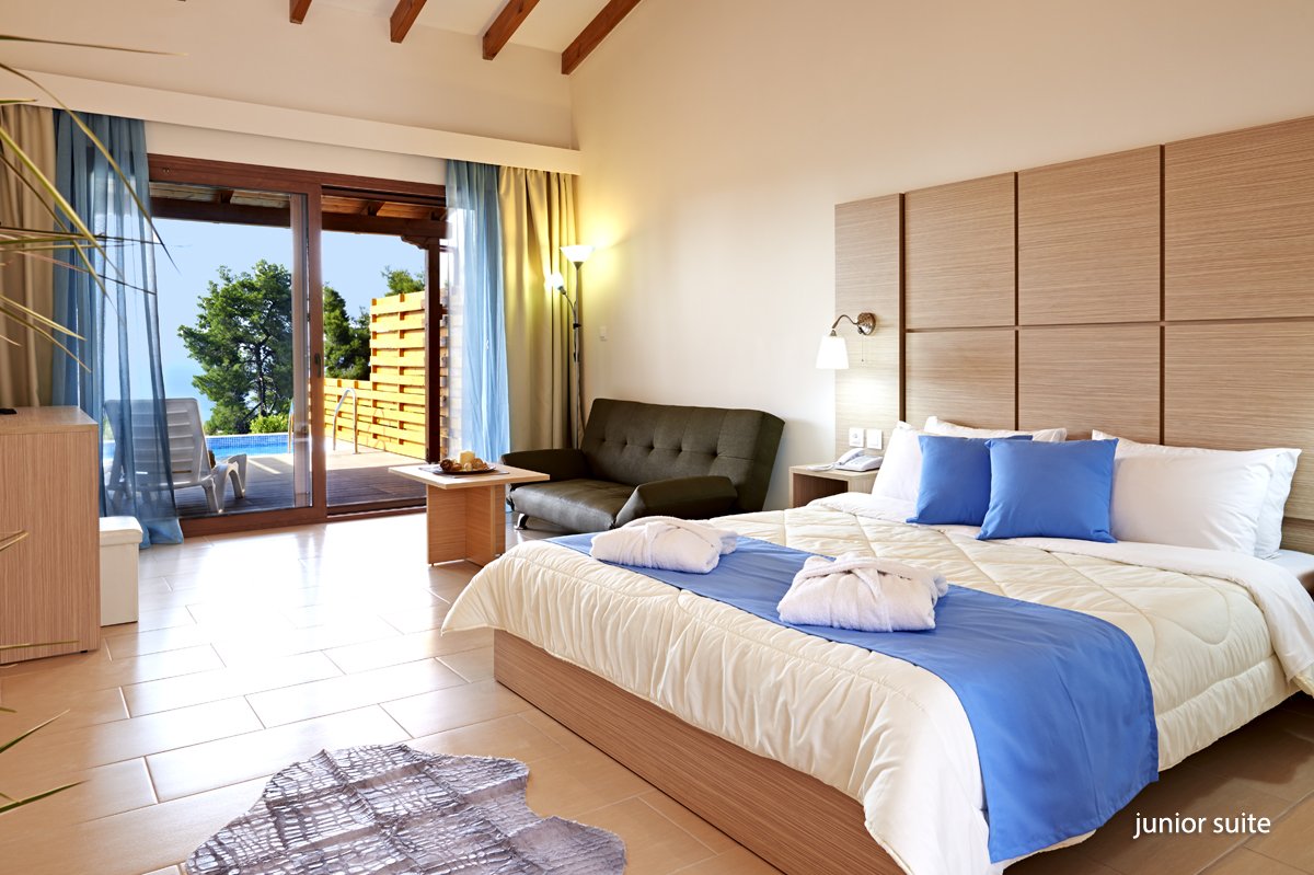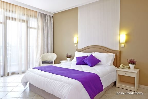 standardowy: 2-os. (możliwość 1 dostawki), ok. 25 m², indywidualnie sterowana klimatyzacja (w terminie: 3.04-28.10), łazienka (wanna lub prysznic, wc; suszarka), internet bezprzewodowy, telewizja satelitarna, polski kanał, telefon, zestaw do kawy/herbaty, sejf, deska do prasowania i żelazko, minibar (płatny); bezpłatne łóżeczko dla dziecka do 2 lat na zamówienie przed przyjazdem; balkon lub wyjście do ogrodu (stolik i krzesełka, suszarka), boczny widok na morze; frontalny widok na morze za dopłatą; junior suite: 2-os. (możliwość 1 dostawki dla os. dorosłej lub 2 dzieci), ok. 32 m², prywatny basen (ok. 9 m²), wyposażenie jak w pokoju standardowym, taras lub ogródek, widok na ogród; pokój junior suite za dopłatą.