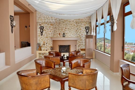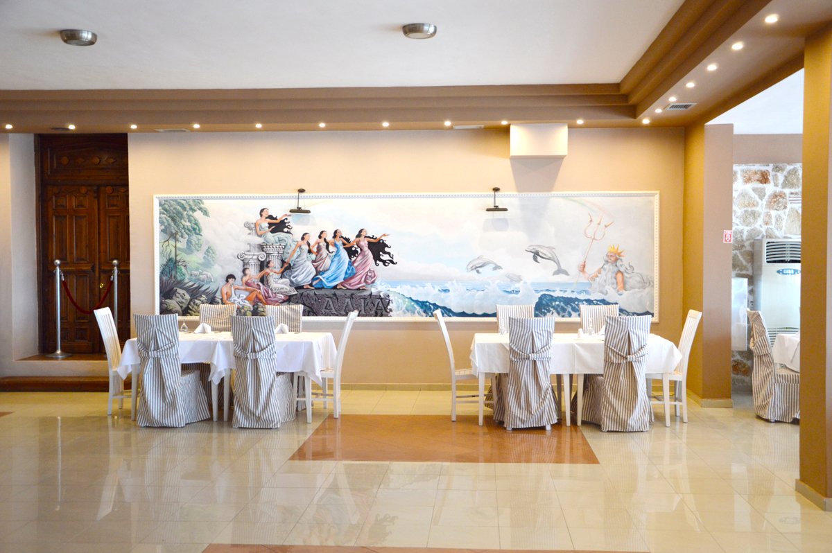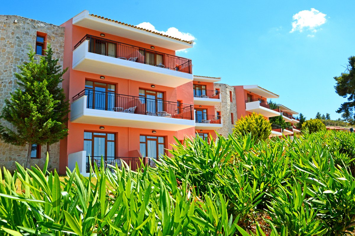 pięciogwiazdkowy, zbudowany w 2003 r., regularnie odnawiany, 118 pokoi, 7 budynków (pokoje junior suite ok. 200 m od budynku głównego), 2 piętra, przestronne i eleganckie lobby, całodobowa recepcja, restauracja główna Poseidon – dania w formie bufetu, kuchnia grecka i międzynarodowa, dostępne foteliki dla dzieci, dania wegetariańskie, 3 razy w tygodniu wieczór tematyczny, podczas kolacji obowiązuje strój formalny (panowie – długie spodnie), 2 restauracje á la carte, bar w lobby, bar przy basenie; sklep z pamiątkami i biżuterią; taras z widokiem na basen i morze, ogród, bezpłatny internet bezprzewodowy; za opłatą: room-service, lekarz na wezwanie, pralnia, wypożyczalnia samochodów, motocykli, rowerów i łódek; na terenie hotelu występują schody i różnice poziomów – niepolecany osobom z ograniczeniami ruchowymi; akceptowane karty kredytowe: Visa, MasterCard.