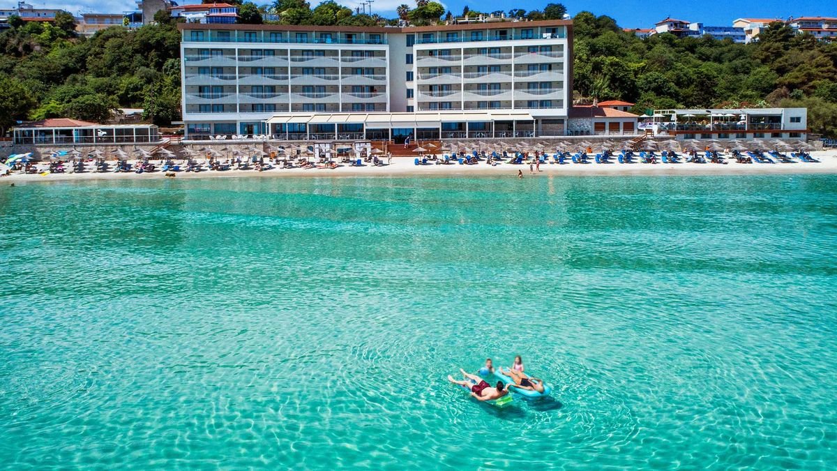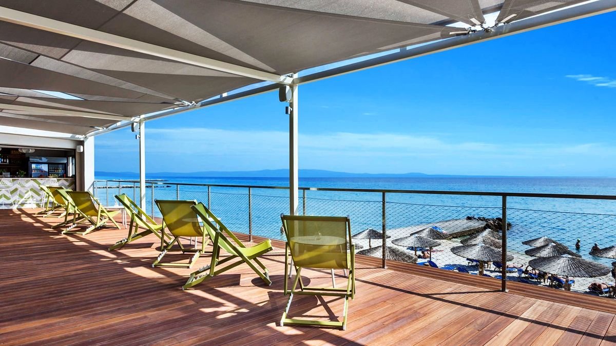 na półwyspie Kassandra, w pierwszej linii brzegowej, w miejscowości KALLITHEA, ok. 200 m do sklepów, barów i restauracji; ok. 79 km od lotniska w Salonikach.