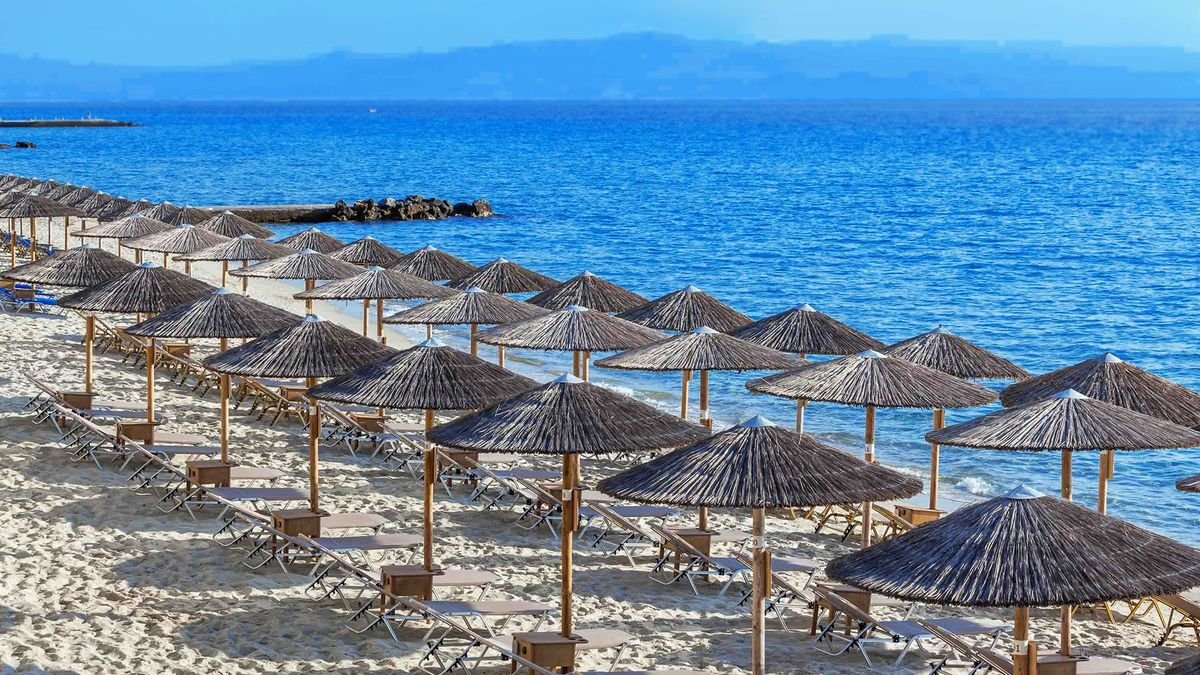Kallithea, publiczna, wydzielona część hotelowa, piaszczysta, łagodne zejście do morza, wyróżniona certyfikatem Błękitna Flaga, bezpośrednio przy hotelu, zejście schodami, bezpłatne parasole i leżaki, ręczniki za kaucją.