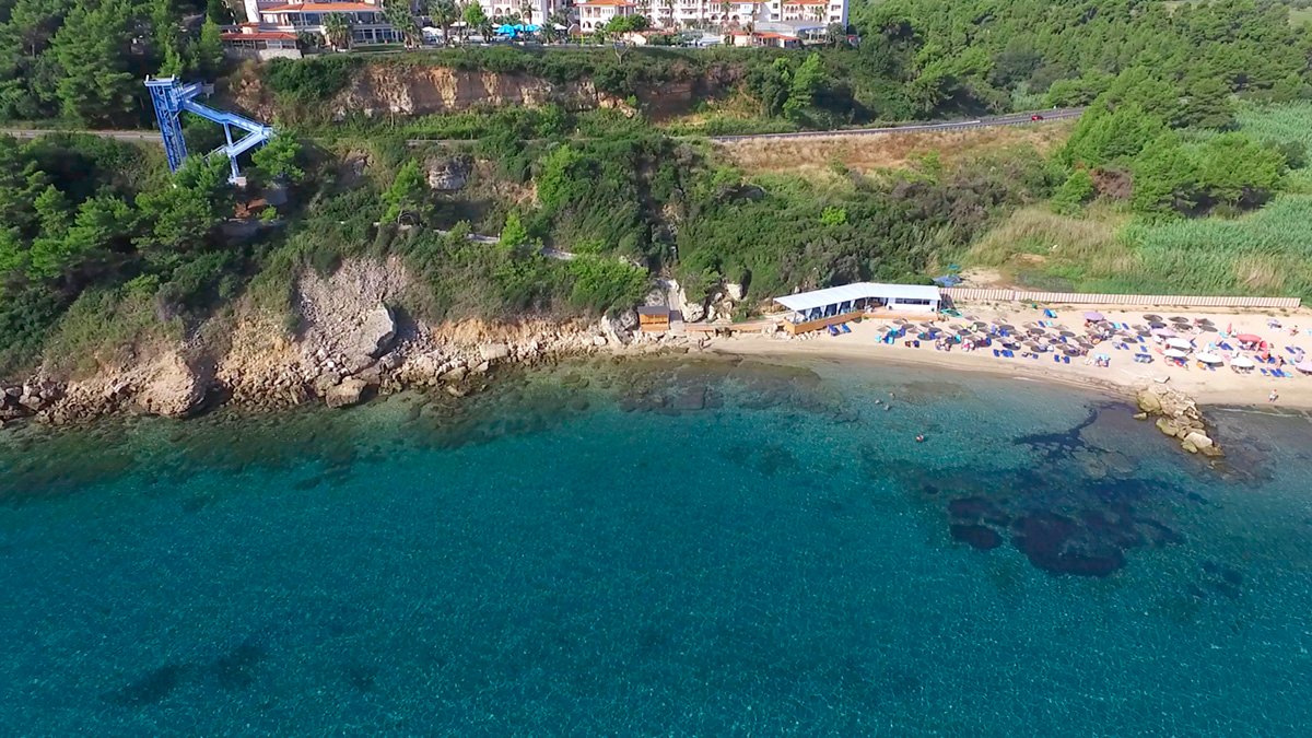 publiczna, piaszczysto-żwirkowa, łagodne zejście do morza, dno kamieniste, zalecane obuwie ochronne, ok. 50 m od hotelu, przejście kładką nad drogą, zjazd windą oraz dojście stromą ścieżką i schodami, parasole i leżaki płatne (ok. 5 EUR/komplet).