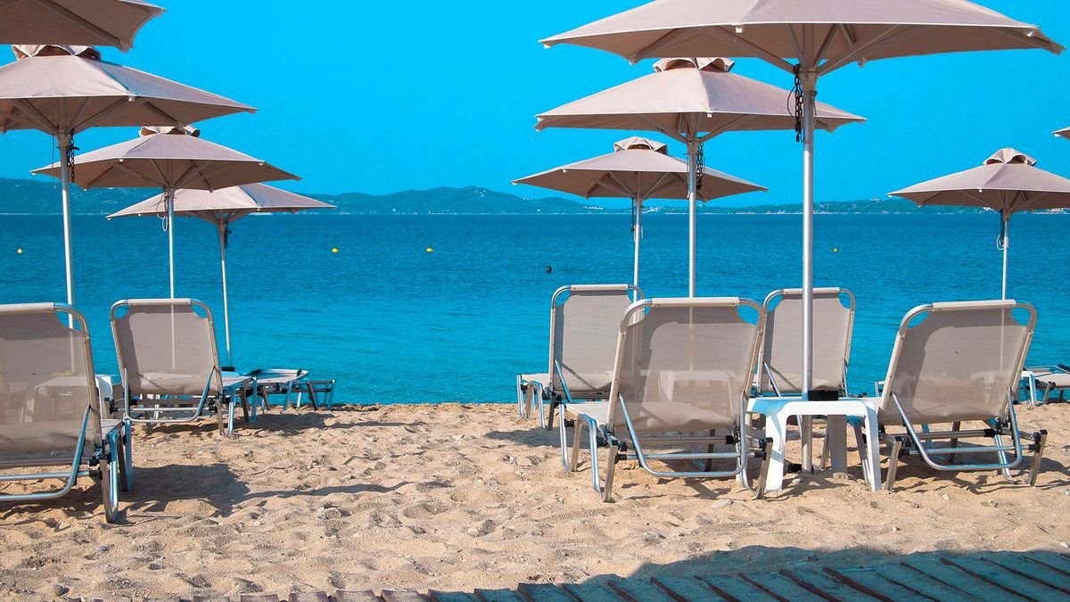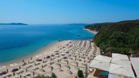 hotelowa, piaszczysta z drobnymi kamykami, naprzeciwko hotelu (ok. 50-250 m – w zależności od zakwaterowania), wyróżniona certyfikatem Błękitna Flaga, przejście przez drogę lub tunelem pod drogą, bezpłatne parasole i leżaki, ręczniki płatne; bar objęty all inclusive.