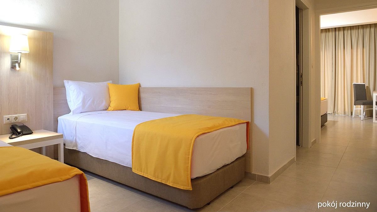 standardowy: 2-os. (możliwość 1 dostawki), ok. 22 m² odnowiony, klimatyzowany, łazienka (wanna lub prysznic, wc; suszarka), internet bezprzewodowy, telewizja satelitarna, telefon, lodówka, sejf; bezpłatne łóżeczko dla dziecka do 2 lat na zamówienie przed przyjazdem; balkon (stolik i krzesełka), widok na ogród; widok na morze za dopłatą; superior: 2-os. (możliwość 1 lub 2 dostawek dla dzieci), ok. 30 m², odnowiony, klimatyzowany, łazienka (wanna lub prysznic, wc; suszarka), internet bezprzewodowy, telewizja satelitarna, telefon, lodówka, sejf; bezpłatne łóżeczko dla dziecka do 2 lat na zamówienie przed przyjazdem; balkon (stolik i krzesełka), widok na morze; pokój superior za dopłatą; rodzinny: dla maks. 4 os. dorosłych (dostawki - 2 łóżka pojedyncze), ok. 45 m², dwa pomieszczenia, odnowiony, klimatyzowany, łazienka (wanna lub prysznic, wc; suszarka), internet bezprzewodowy, telewizja satelitarna, telefon, lodówka, sejf; bezpłatne łóżeczko dla dziecka do 2 lat na zamówienie przed przyjazdem; balkon (stolik i krzesełka), widok na ogród; pokój rodzinny za dopłatą.