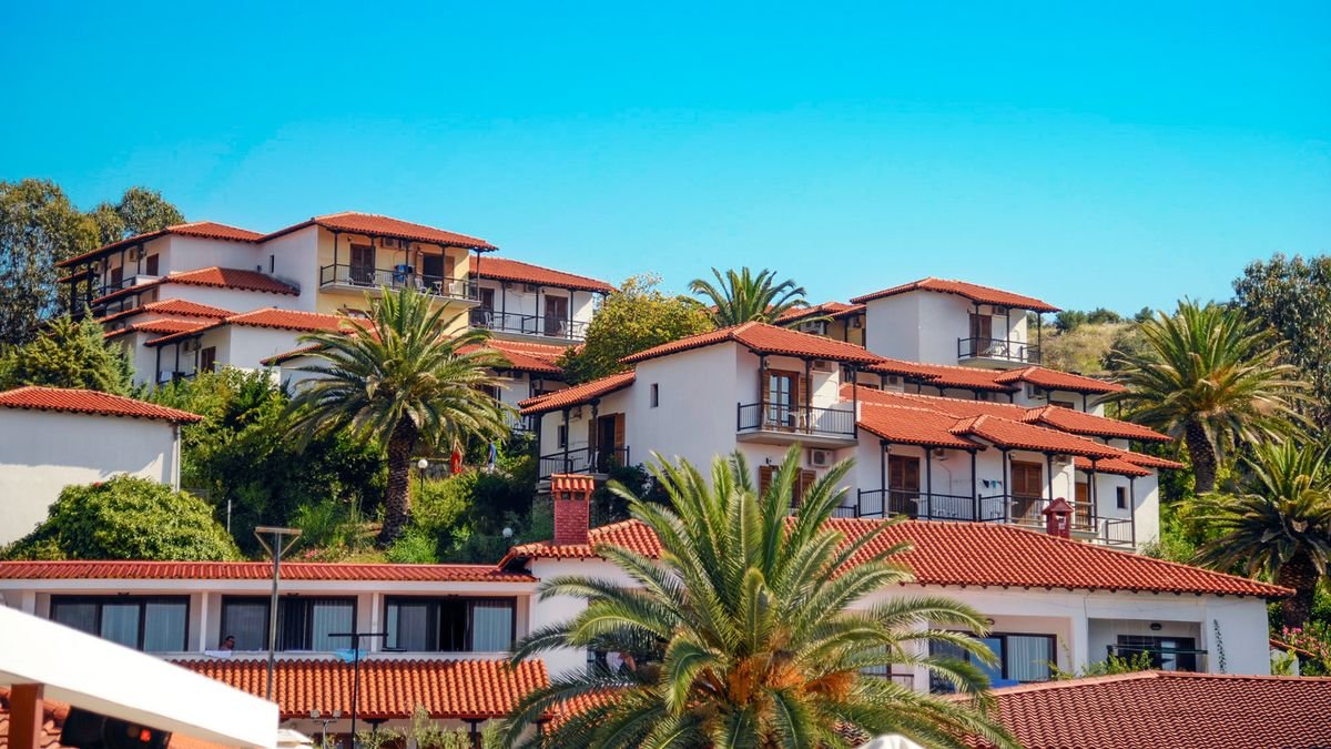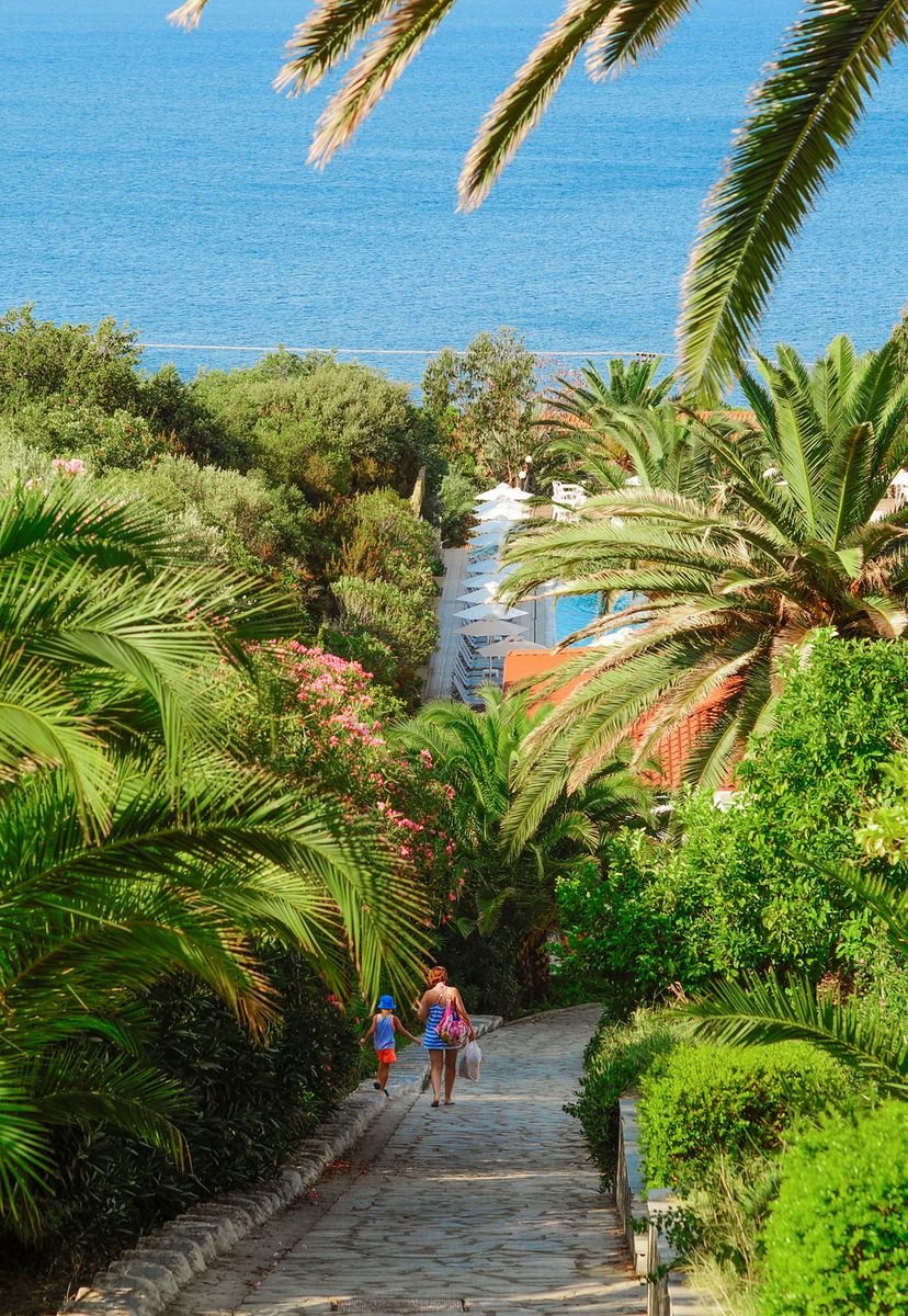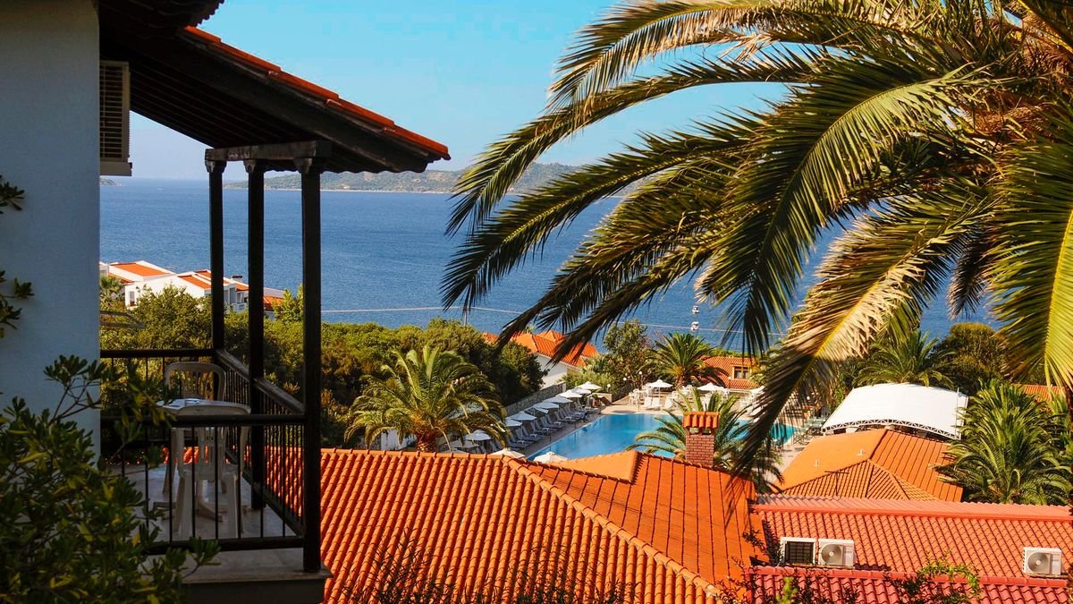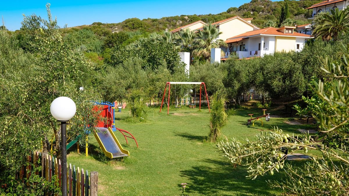na półwyspie Athos, na wzgórzu, przy drodze lokalnej, ok. 3 km od centrum OURANOU¬POLI ze sklepami i barami; ok. 125 km od lotniska w Salonikach; bus hotelowy do Ierrisos i Ouranoupoli (płatny: ok. 1 EUR/3 EUR); przystanek autobusowy ok. 100 m od hotelu (Saloniki, Ouranoupoli).