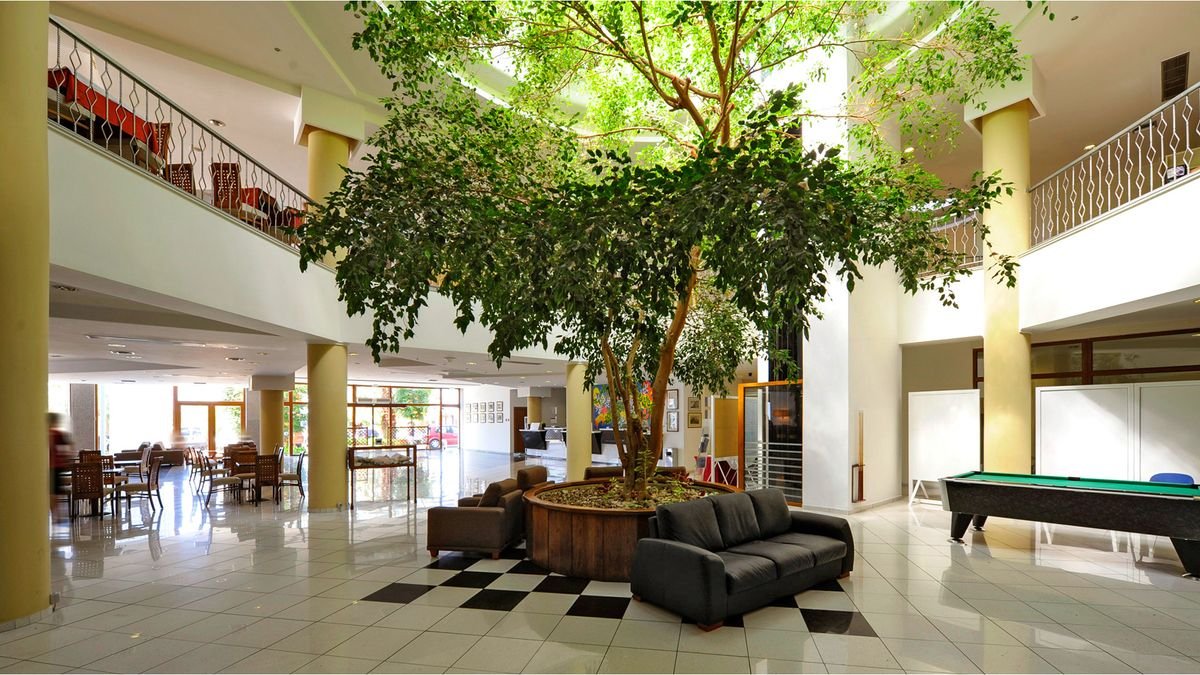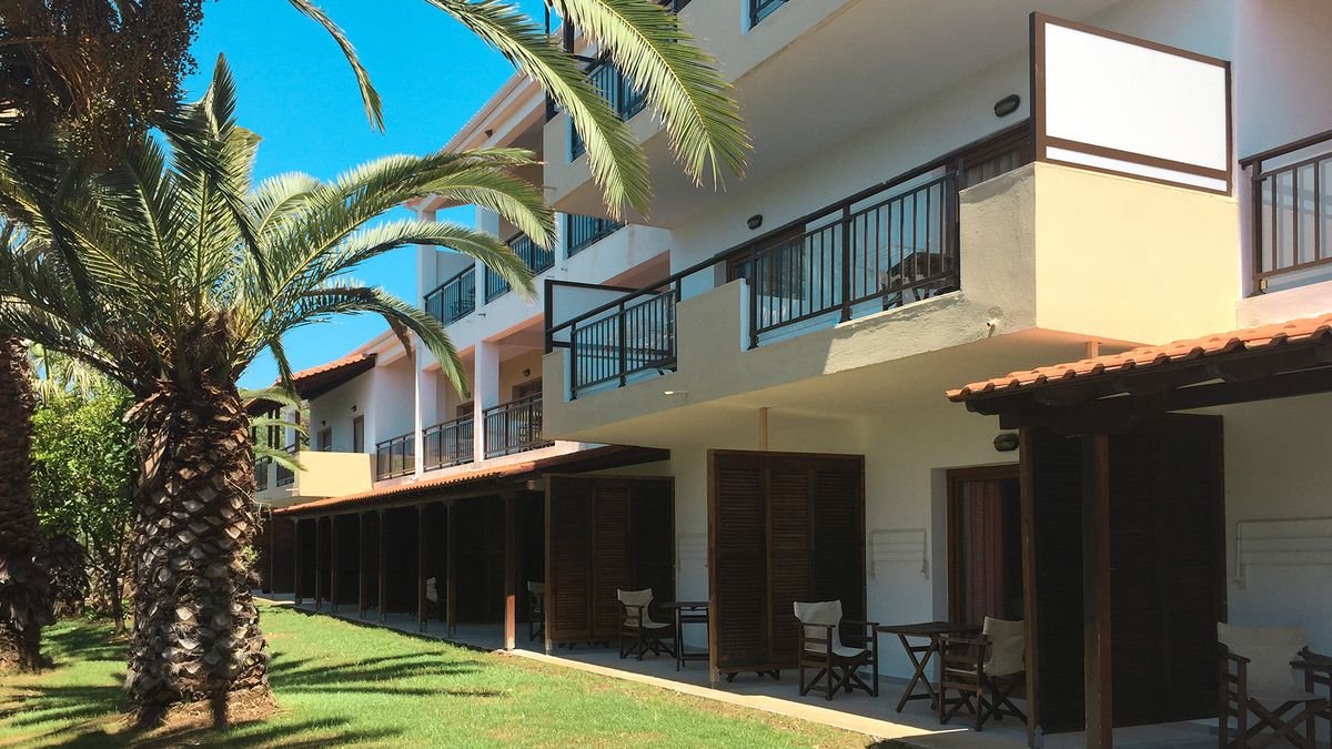 czterogwiazdkowy, stylowy, elegancki, zbudowany w 1990 r., odnowiony zimą 2017/2018 r. (poza lobby i barem przy basenie) 240 pokoi, 10 budynków, 2 piętra, winda, przestronne lobby, całodobowa recepcja, restauracja główna – dania w formie bufetu, kuchnia grecka i międzynarodowa, dostępne foteliki i menu dla dzieci, dania wegetariańskie, podczas kolacji wymagany strój formalny (panowie – długie spodnie), raz w tygodniu show cooking, wieczory tematyczne; 2 bary: bar przy basenie, bar na plaży; taras z widokiem na morze, centrum konferencyjne dla 1000 osób, bezpłatny internet bezprzewodowy, minimarket; za opłatą: sejf w recepcji (ok. 21 EUR/tydz.), pralnia, lekarz na zapytanie, room-service; występują schody i różnice poziomów – niepolecany osobom z ograniczeniami ruchowymi; akceptowane karty kredytowe: Visa, MasterCard.