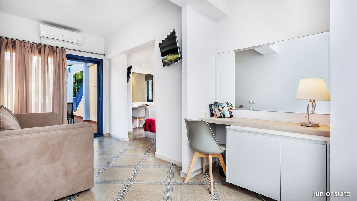 czterogwiazdkowy, zbudowany w 1999 r., częściowo odnowiony w 2019 r., 123 pokoje, 3 budynki, 2 piętra, przestronne lobby, całodobowa recepcja, restauracja Athos – dania w formie bufetu, kuchnia grecka i śródziemnomorska, podczas kolacji wymagany strój formalny (panowie długie spodnie), bar przy basenie; ogród; bezpłatny internet bezprzewodowy; za opłatą: room-service, opiekunka do dziecka, pralnia, wypożyczalnia rowerów; akceptowane karty kredytowe: Visa, MasterCard.
