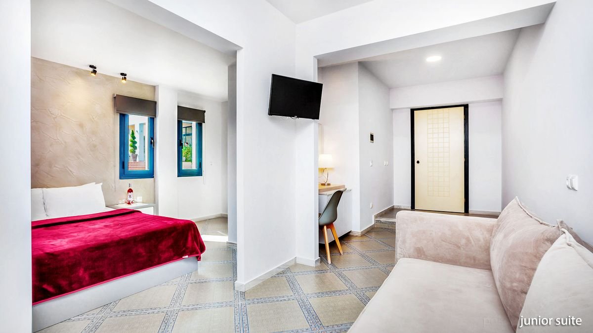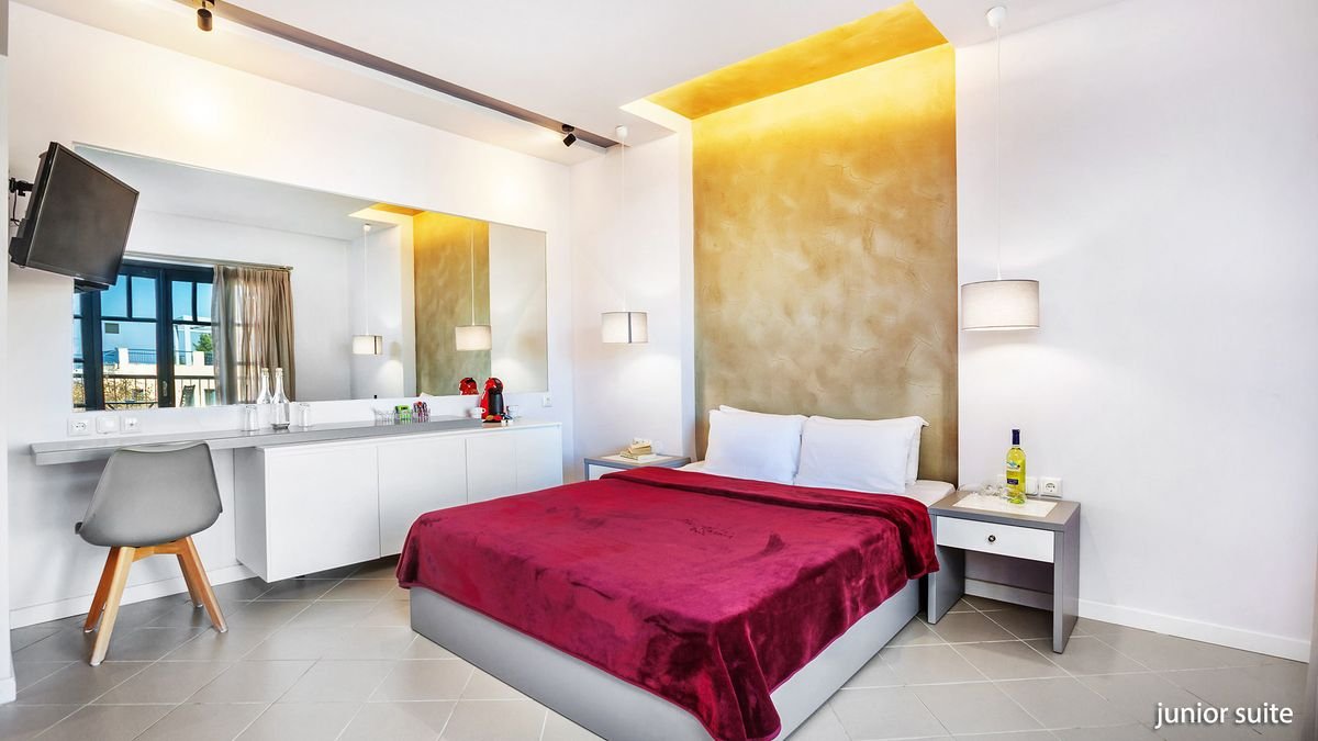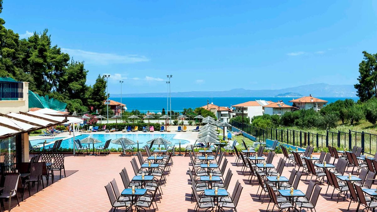 czterogwiazdkowy, zbudowany w 1999 r., częściowo odnowiony w 2019 r., 123 pokoje, 3 budynki, 2 piętra, przestronne lobby, całodobowa recepcja, restauracja Athos – dania w formie bufetu, kuchnia grecka i śródziemnomorska, podczas kolacji wymagany strój formalny (panowie długie spodnie), bar przy basenie; ogród; bezpłatny internet bezprzewodowy; za opłatą: room-service, opiekunka do dziecka, pralnia, wypożyczalnia rowerów; akceptowane karty kredytowe: Visa, MasterCard.