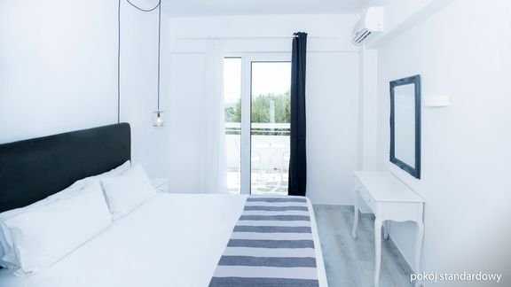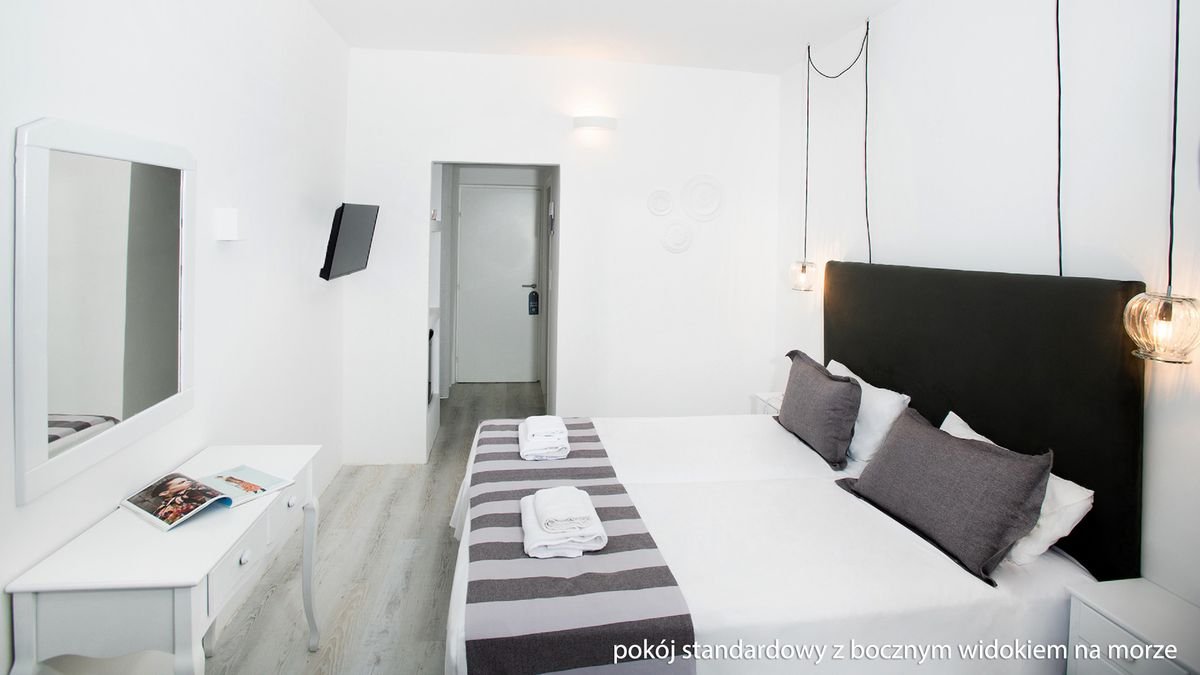 standardowy : 2-os., ok. 19 m², nowoczesny, komfortowy, indywidualnie sterowana klimatyzacja, łazienka (prysznic, wc; suszarka), telewizja satelitarna, telefon, lodówka, zestaw do kawy/herbaty, sejf, balkon (stolik i krzesełka); widok na ogród; ; standardowy z bocznym widokiem na morze : 2-os. (możliwość 1 dostawki dla dziecka do 13 lat – rozkładany fotel), ok. 19 m²; wyposażenie jak w pokoju standardowym; boczny widok na morze; pokój standardowy z bocznym widokiem na morze za dopłatą.