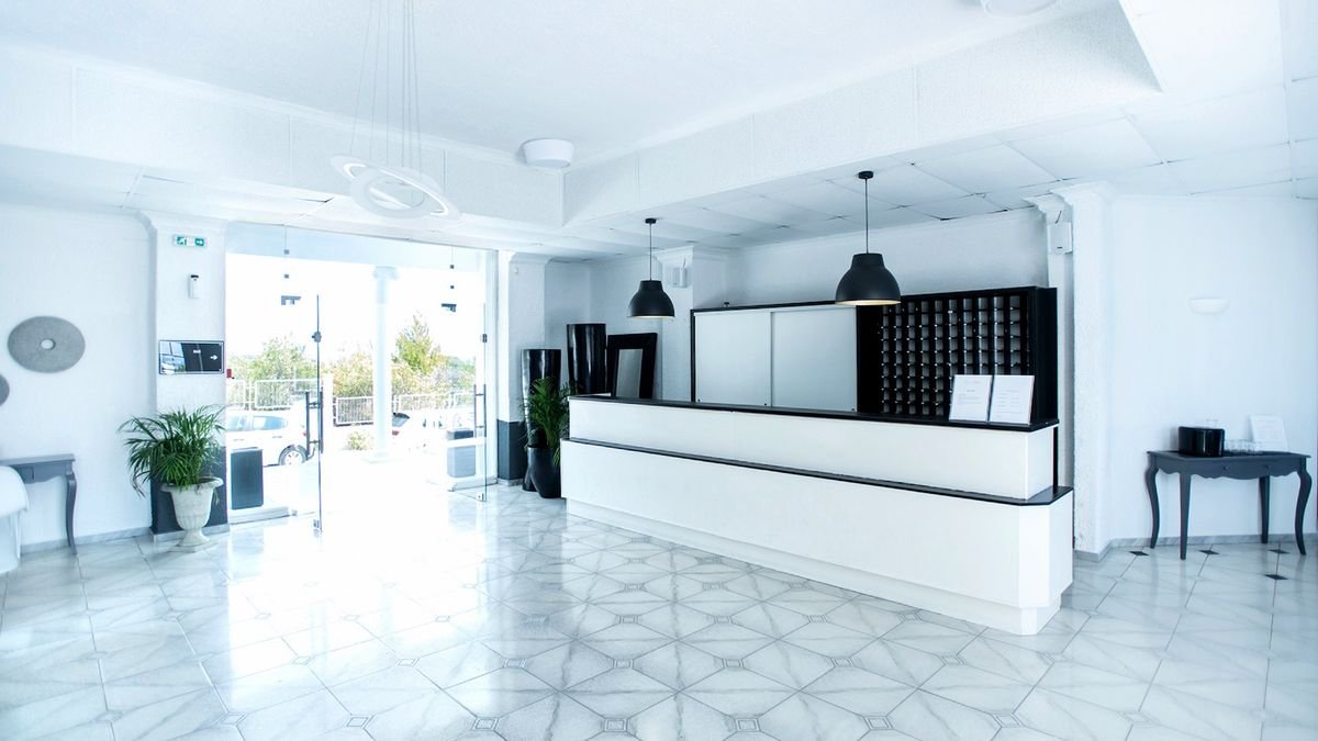 czterogwiazdkowy, nowoczesny i luksusowy, całkowicie odnowiony w 2019 r., łącznie 102 pokoje o różnej typologii, budynek główny, winda, 1-2 piętra, przestronne i eleganckie lobby, całodobowa recepcja, restauracja Bianco – dania w formie bufetu, kuchnia międzynarodowa, menu dla dzieci, dania wegetariańskie, podczas kolacji wymagany jest strój formalny (panowie – długie spodnie), bary: w lobby i przy basenie; taras z widokiem na ogród i morze; bezpłatny internet bezprzewodowy; za opłatą: prywatny transfer z lotniska, opiekunka do dziecka, wypożyczalnia samochodów i łodzi, pralnia; akceptowane karty kredytowe: Visa, MasterCard.