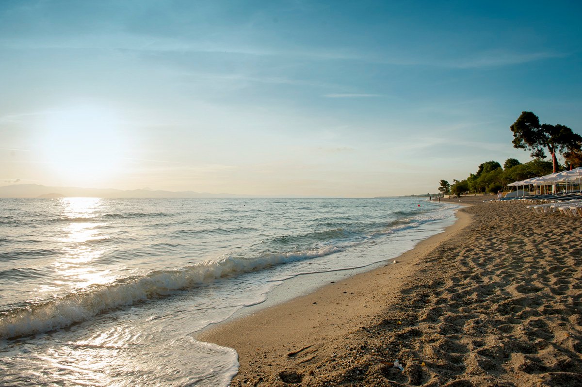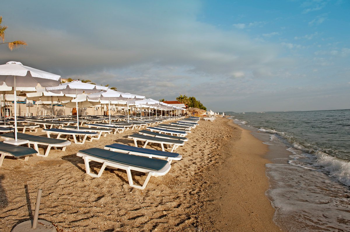publiczna, piaszczysto-żwirowa, łagodne zejście do morza, bezpośrednio przy hotelu, wyróżniona certyfikatem Błękitna Flaga, dojście przez deptak, bezpłatne parasole i leżaki.