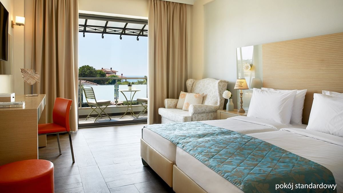 Położony w pięknej zatoce Nea Potidea, jest idealnym miejscem na luksusowe, greckie wakacje. Zjawiskowo położony przy pięknej plaży z widokiem na mityczną górę Olimp, zapewnia doskonałe warunki do relaksu i lenistwa na leżaku. Na miejscu rewelacyjne centrum spa z bogatą ofertą zabiegów pielęgnacyjnych oraz szeroka gama udogodnień sportowo-rekreacyjnych. Piękny wystrój wnętrz, znakomita kuchnia i profesjonalna obsługa zadowolą najbardziej wymagających Gości.