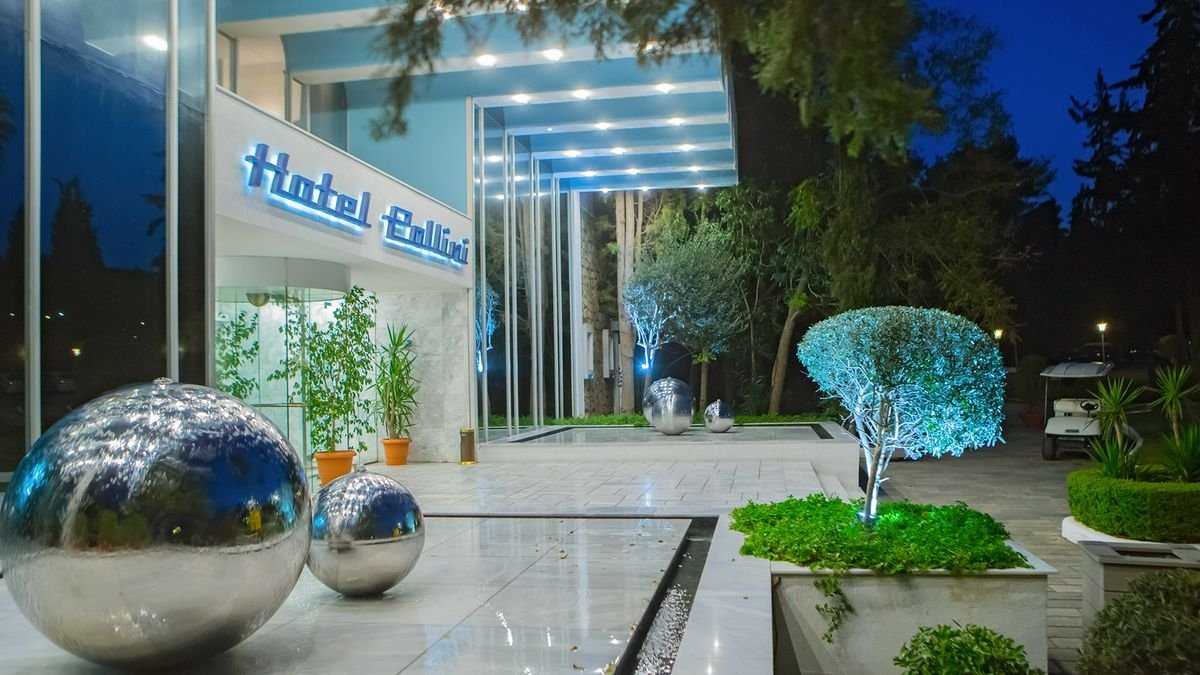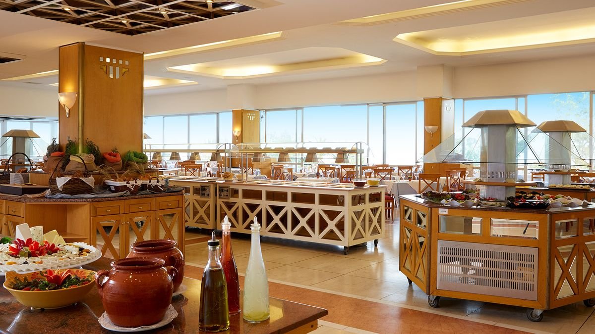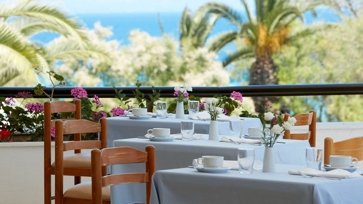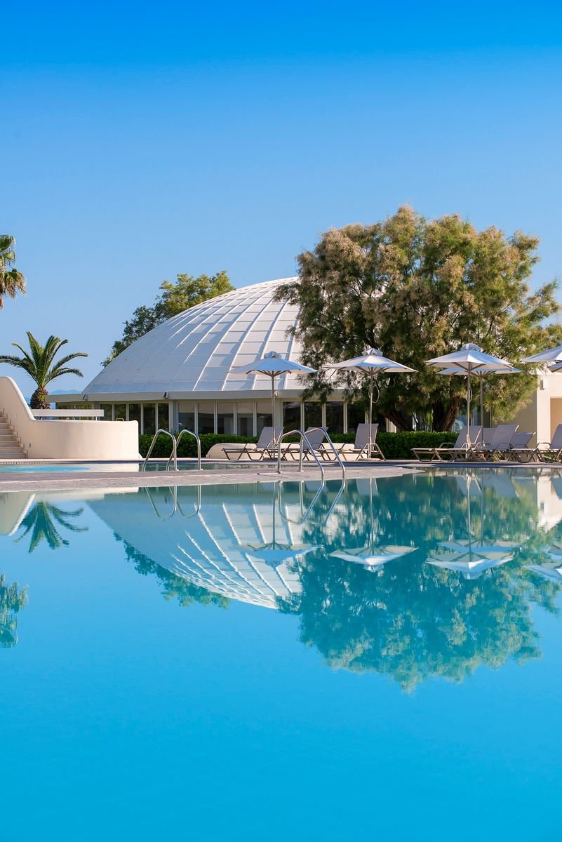 czterogwiazdkowy, zbudowany w 1974 r., odnowiony w 2012 r., 387 pokoi, 10-piętrowy budynek główny, 3 windy, 98 bungalowów, przestronne lobby, całodobowa recepcja, 3 restauracje: główna – dania w formie bufetu, kuchnia międzynarodowa, dostępne dania wegetariańskie, 2 restauracje à la carte: Il Basilico – włoska trattoria i Akrogiali – przy plaży, w restauracjach obowiązuje strój formalny (panowie – długie spodnie), bar przy basenie, bar przy plaży; kantor, minimarket, sklep z pamiątkami; centrum konferencyjne dla 400 osób, taras z widokiem na ogród i morze, bezpłatny internet bezprzewodowy w lobby; za opłatą: opiekunka do dziecka, fryzjer, room-service, pralnia; akceptowane karty kredytowe: Visa, MasterCard.
