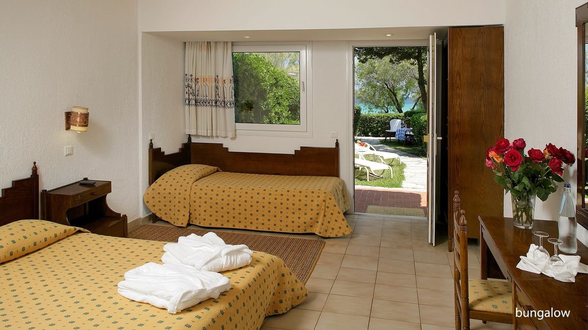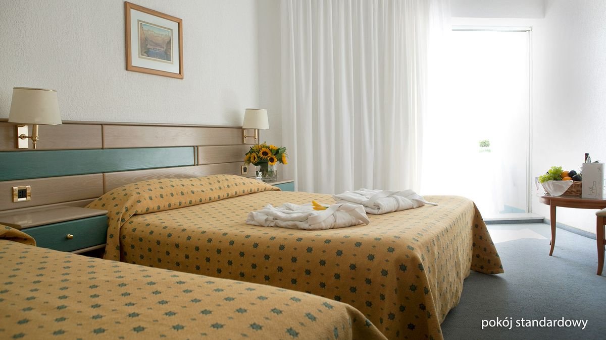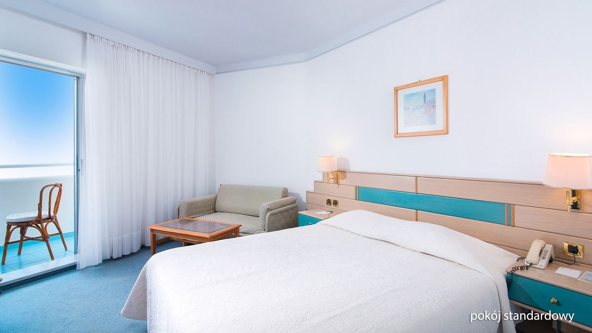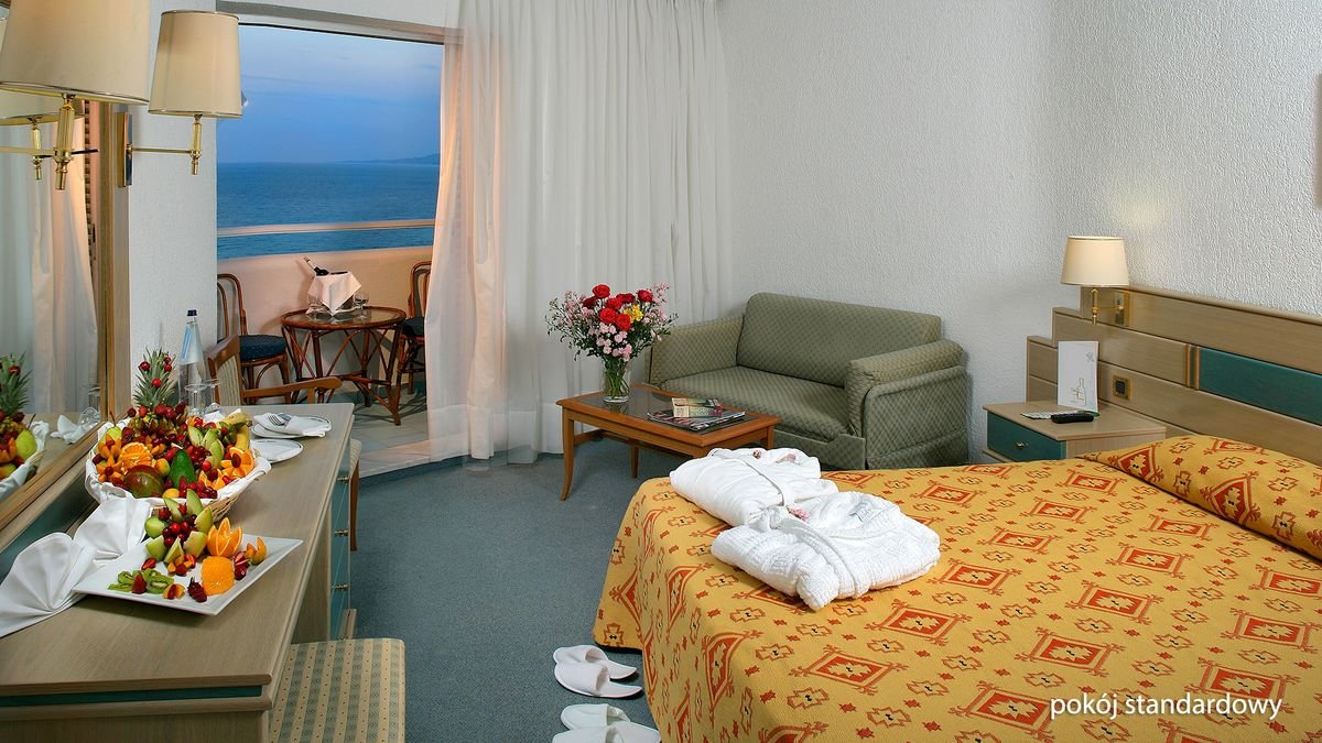 standardowy: 2-os. (możliwość 1 dostawki – sofa), ok. 26 m², zadbany, praktycznie urządzony, klimatyzowany (w terminie: lipiec-sierpień), łazienka (wanna, wc; suszarka), telewizor, telefon, lodówka; za opłatą: sejf; bezpłatne łóżeczko dla dziecka do 2 lat na zamówienie przed przyjazdem; balkon lub taras (stolik i krzesełka); boczny widok na morze; bungalow: 2-os. (możliwość 1 dostawki – łóżko pojedyncze), ok. 26 m², wyposażenie jak w pokoju standardowym; widok na ogród; widok na morze za dopłatą; bungalow za dopłatą; suite: 2-os. (możliwość 1 lub 2 dostawek – sofa i łóżko pojedyncze), ok. 34 m², 2 pomieszczenia, wyposażenie jak w pokoju standardowym; boczny widok na morze; widok na morze za dopłatą; suite za dopłatą.