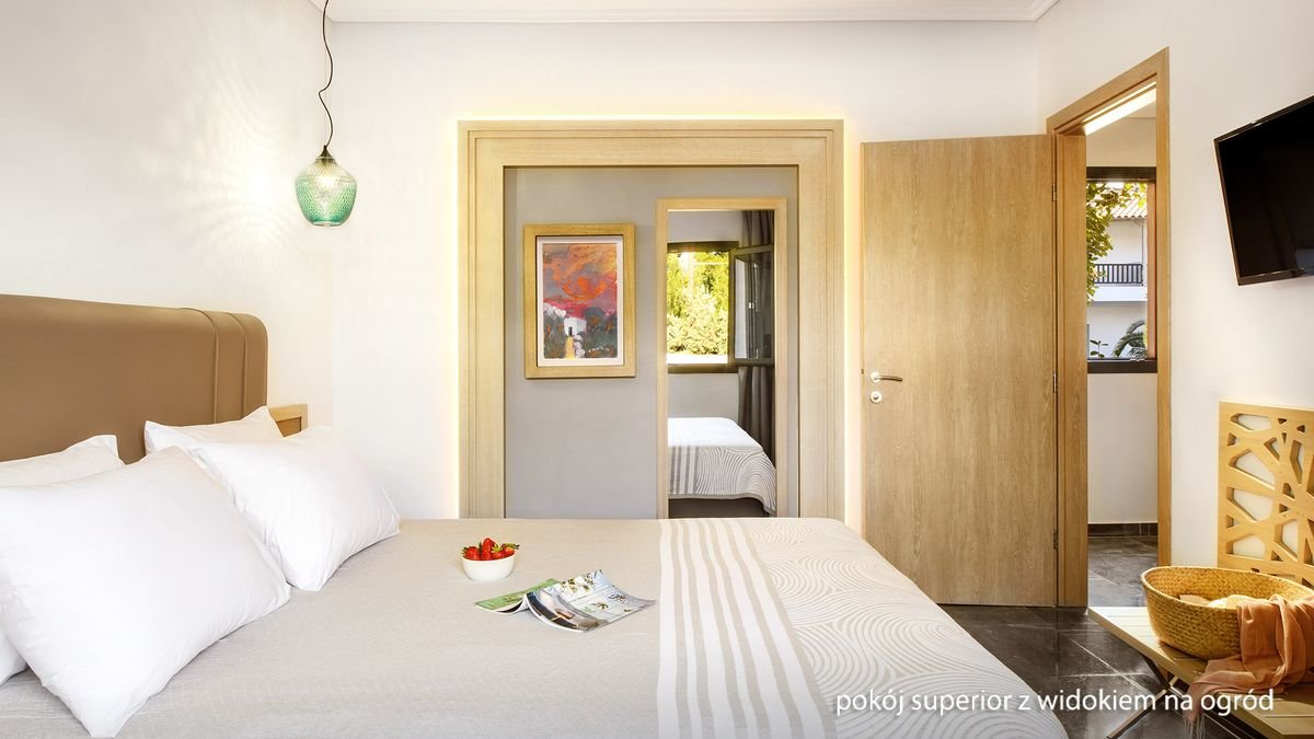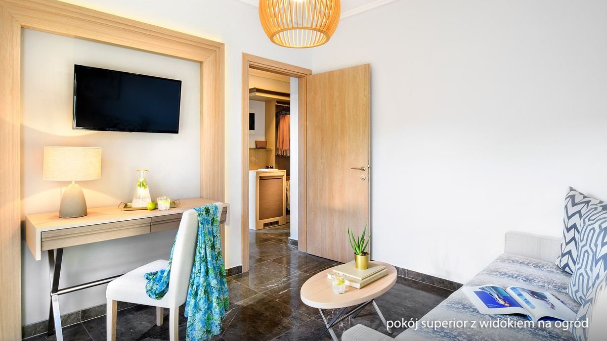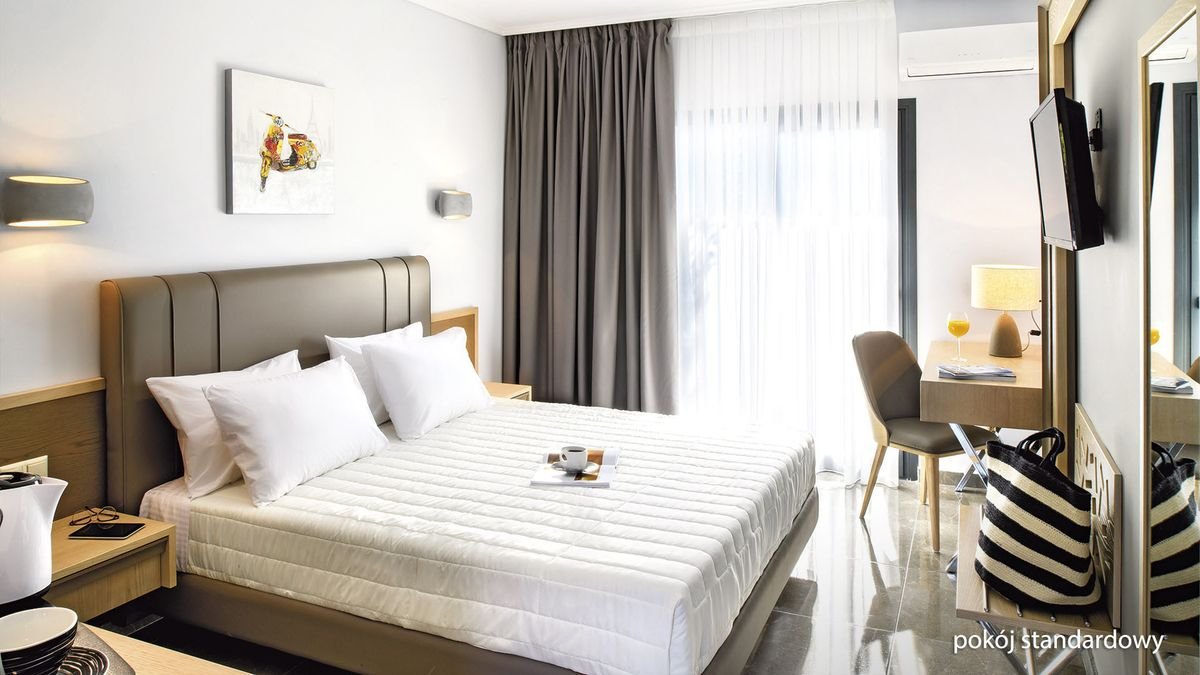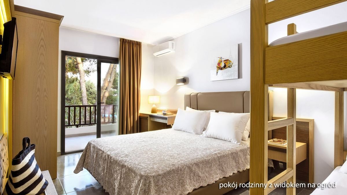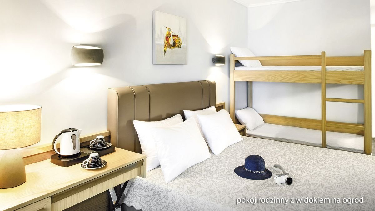 standardowy: 2-os. (możliwość 1 dostawki), ok. 20 m², nowoczesny i komfortowy, indywidualnie sterowana klimatyzacja, łazienka (prysznic, wc; suszarka), telewizja satelitarna, polski program telewizyjny, telefon, lodówka, zestaw do kawy/herbaty, sejf, balkon lub taras (stolik i krzesełka); łóżeczko dla dziecka do lat 2 na zamówienie; widok na ogród; standardowy z widokiem na basen: 2-os. (możliwość 1 dostawki – rozkładany fotel), ok. 20 m², wyposażenie jak w pokoju standardowym; widok na basen; pokój standardowy z widokiem na basen za dopłatą; superior z widokiem na ogród: 2–os. (możliwość 1 dostawki), ok. 24 m², wyposażenie jak w pokoju standardowym; widok na ogród; pokój superior z widokiem na ogród za dopłatą; rodzinny z widokiem na ogród: 2-os. (możliwość 2 dostawek – łóżko piętrowe), ok. 20 m², wyposażenie jak w pokoju standardowym; widok na ogród; pokój rodzinny z widokiem na ogród za dopłatą.