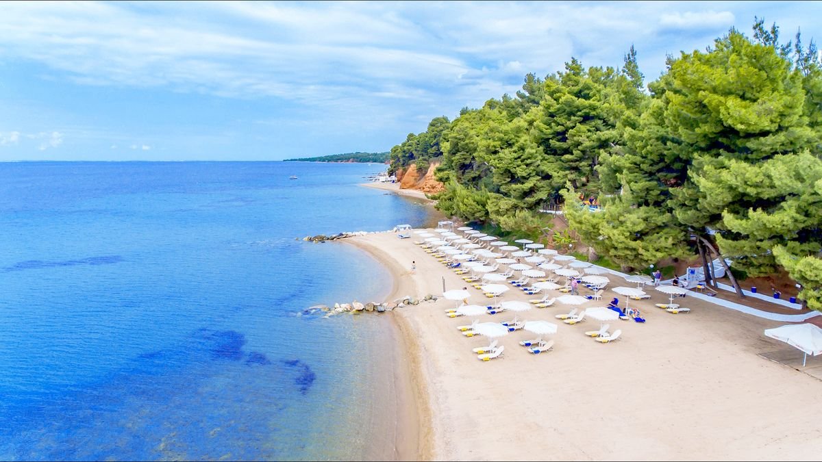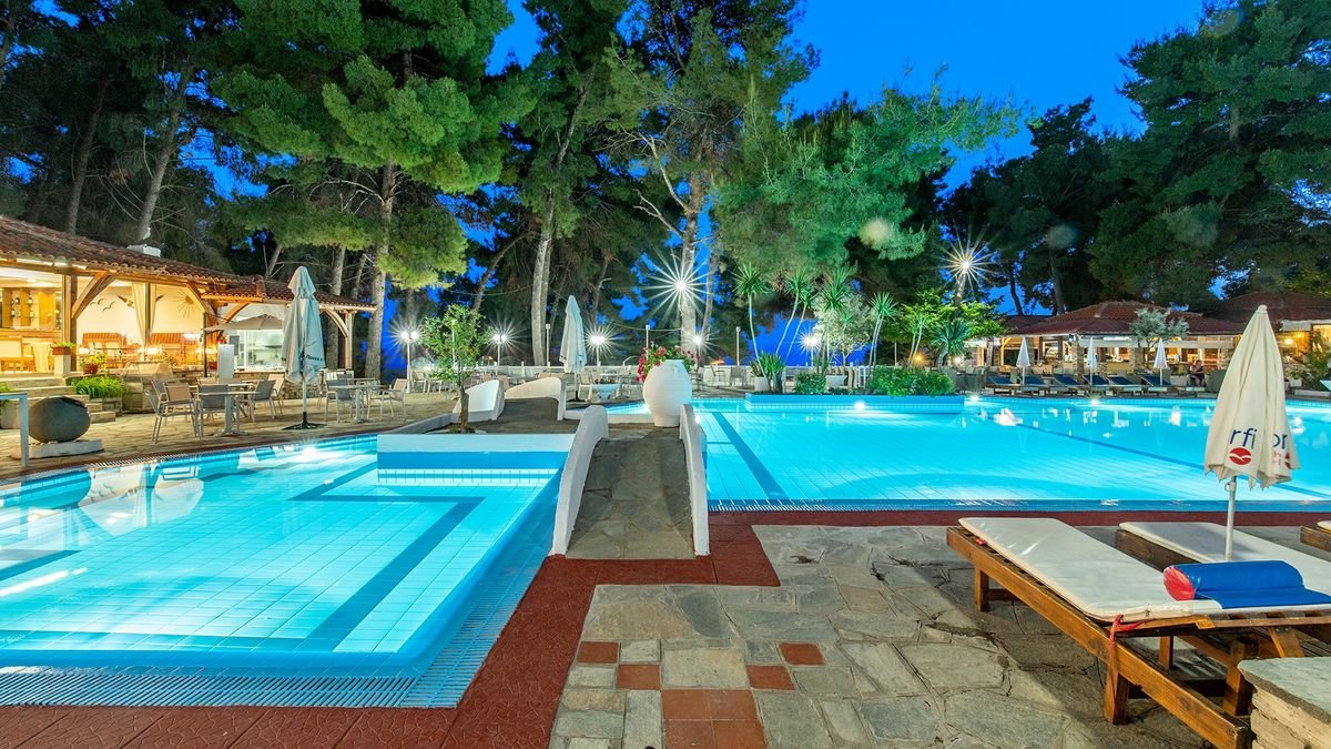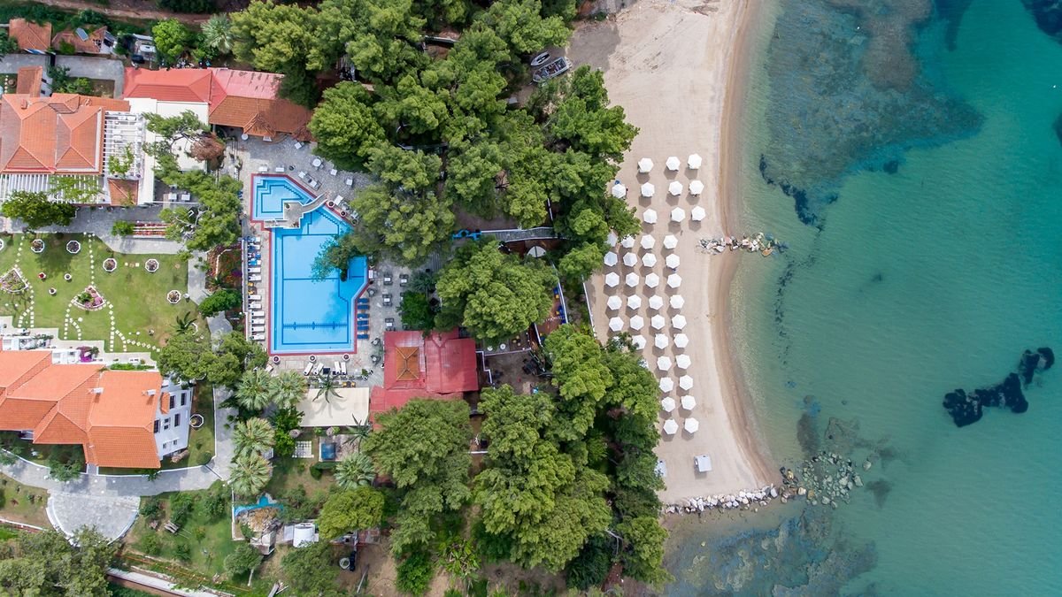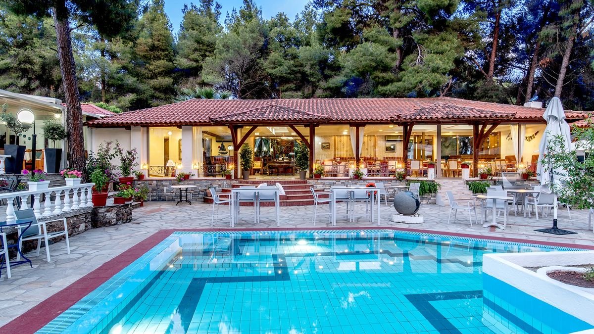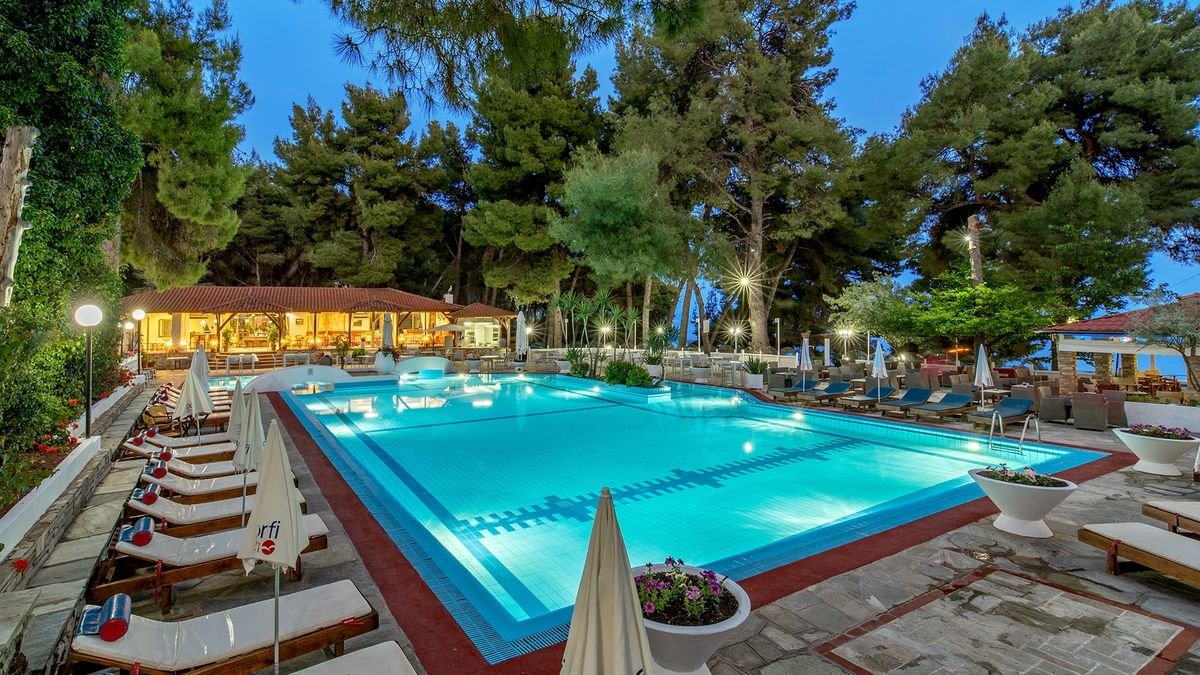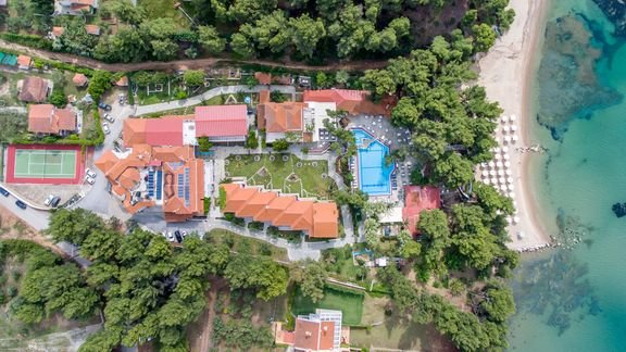 Położony na półwyspie Sithonia w lesie piniowym, tuż przy piaszczystej plaży z bezpłatnym serwisem, oferuje klimatyzowane pokoje, kort tenisowy i basen w pięknym, zadbanym ogrodzie. Utrzymany w greckim stylu, ma wygodne i przestronne pokoje. Doskonałe miejsce na relaks na Chalkidiki, lubianym przez turystów z Polski.