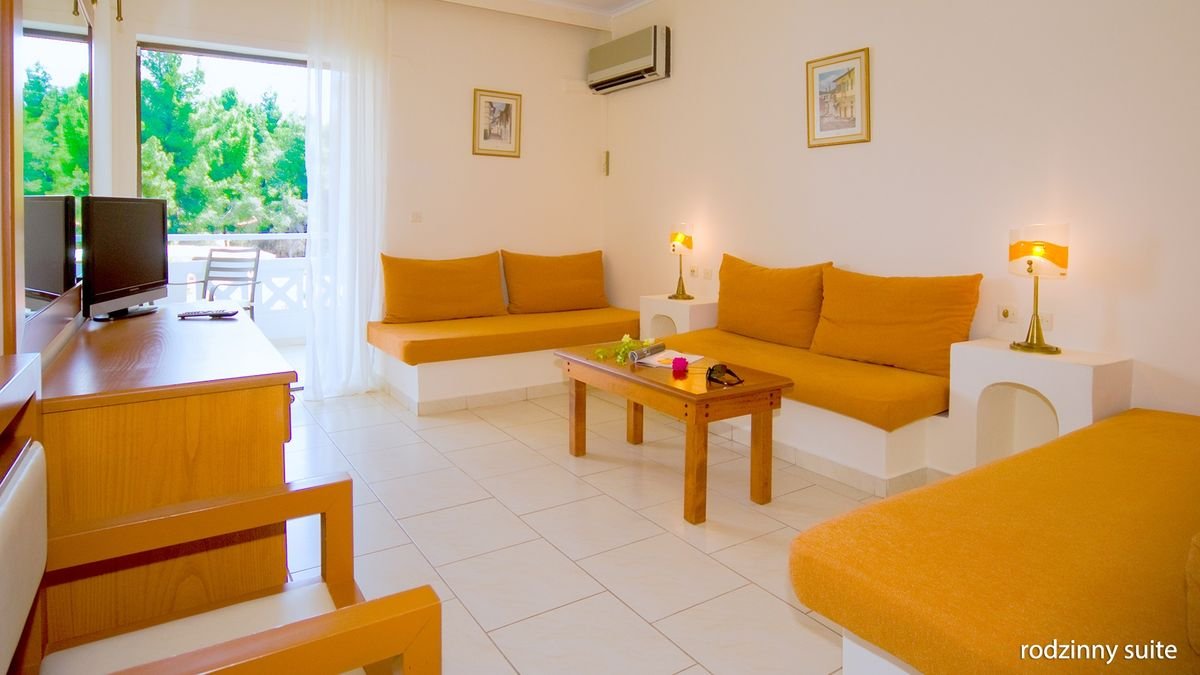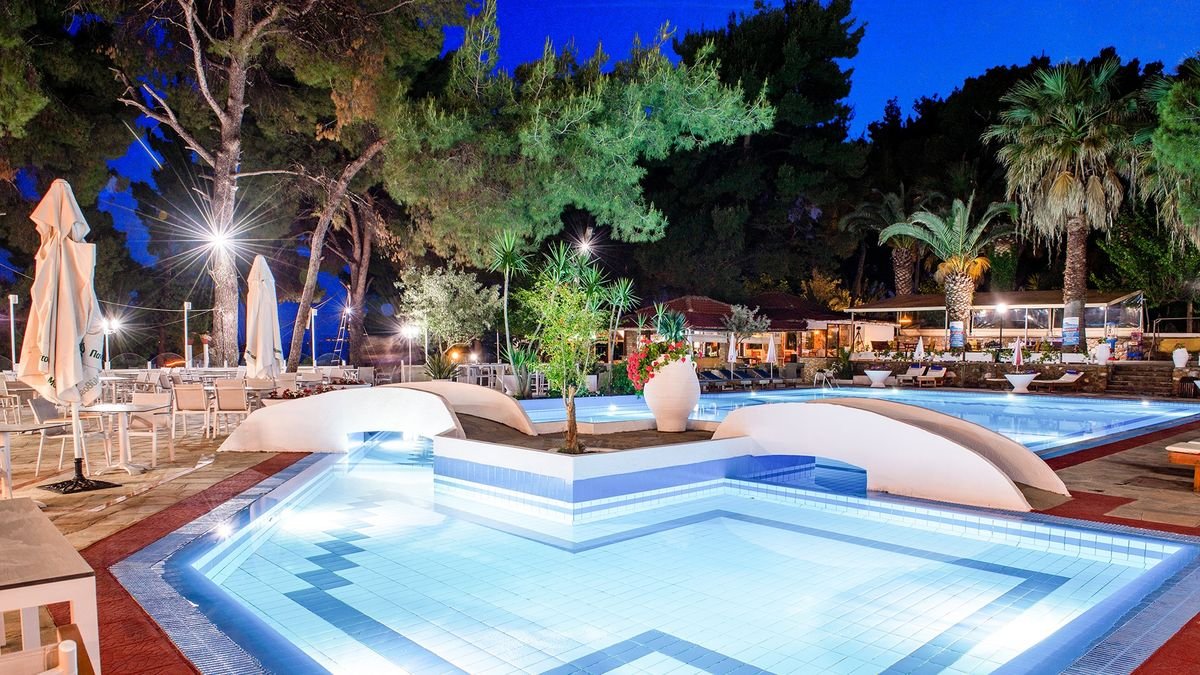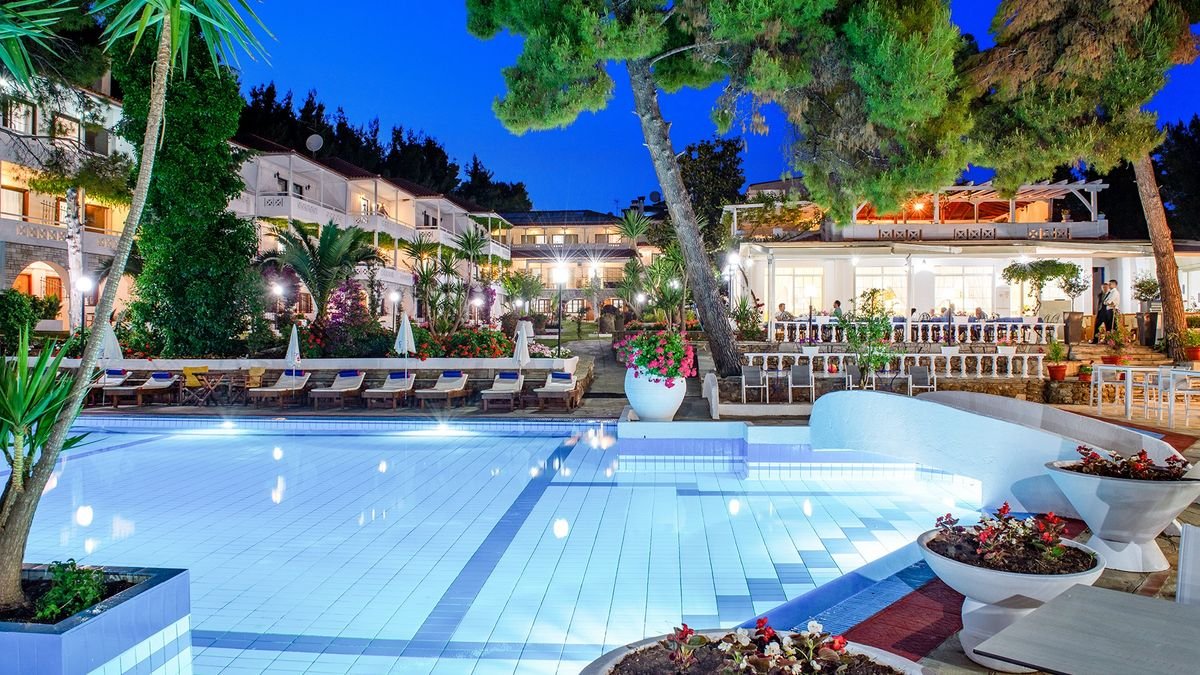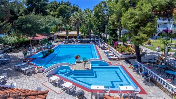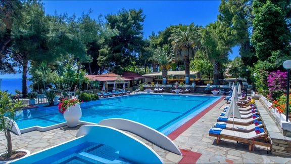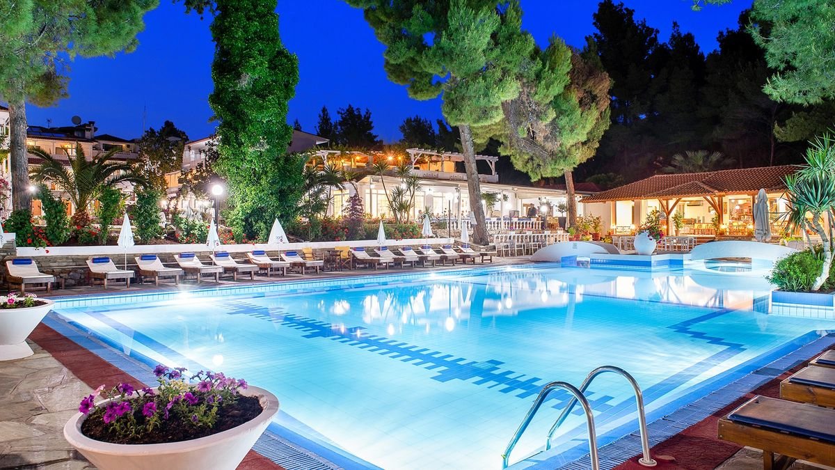 Położony na półwyspie Sithonia w lesie piniowym, tuż przy piaszczystej plaży z bezpłatnym serwisem, oferuje klimatyzowane pokoje, kort tenisowy i basen w pięknym, zadbanym ogrodzie. Utrzymany w greckim stylu, ma wygodne i przestronne pokoje. Doskonałe miejsce na relaks na Chalkidiki, lubianym przez turystów z Polski.