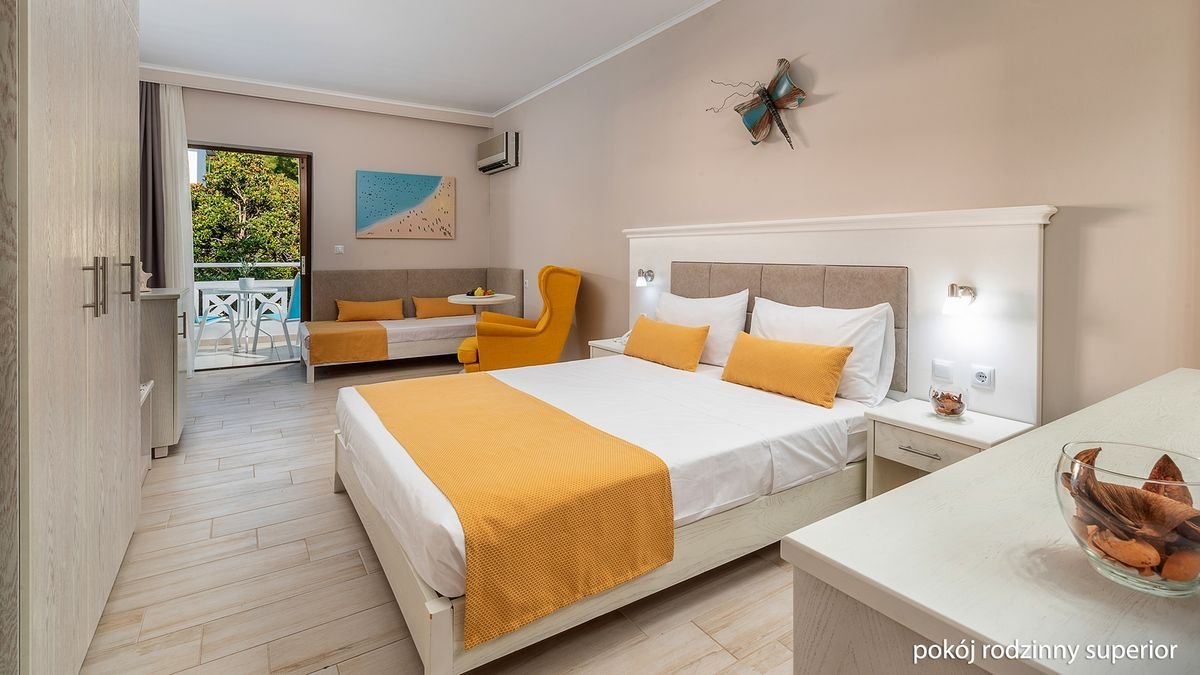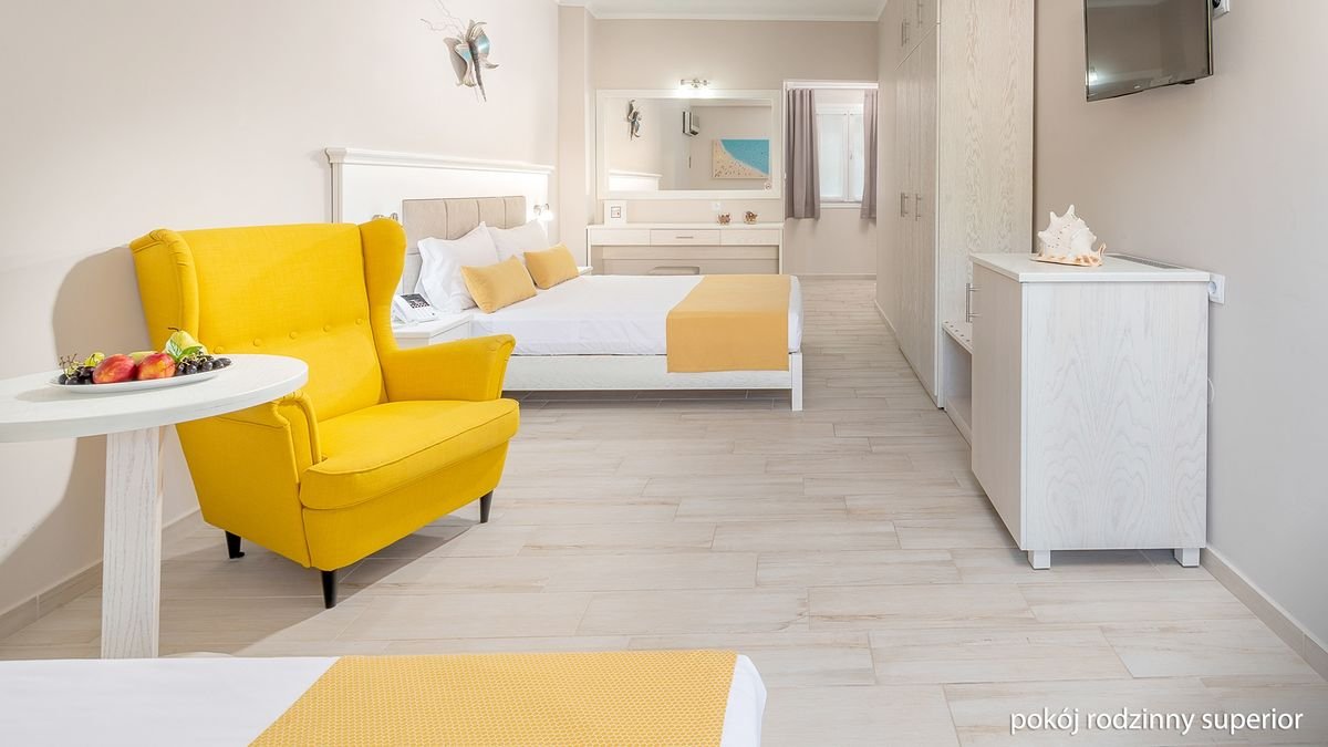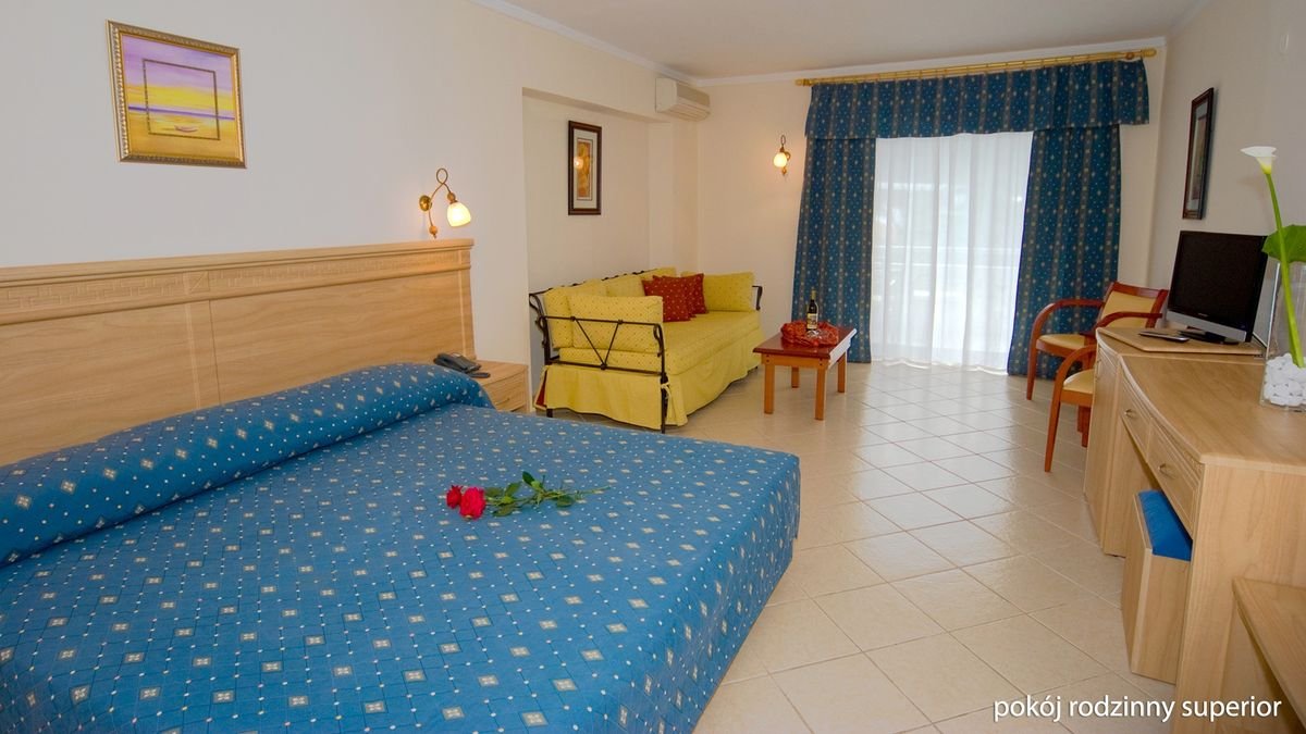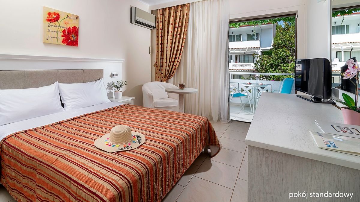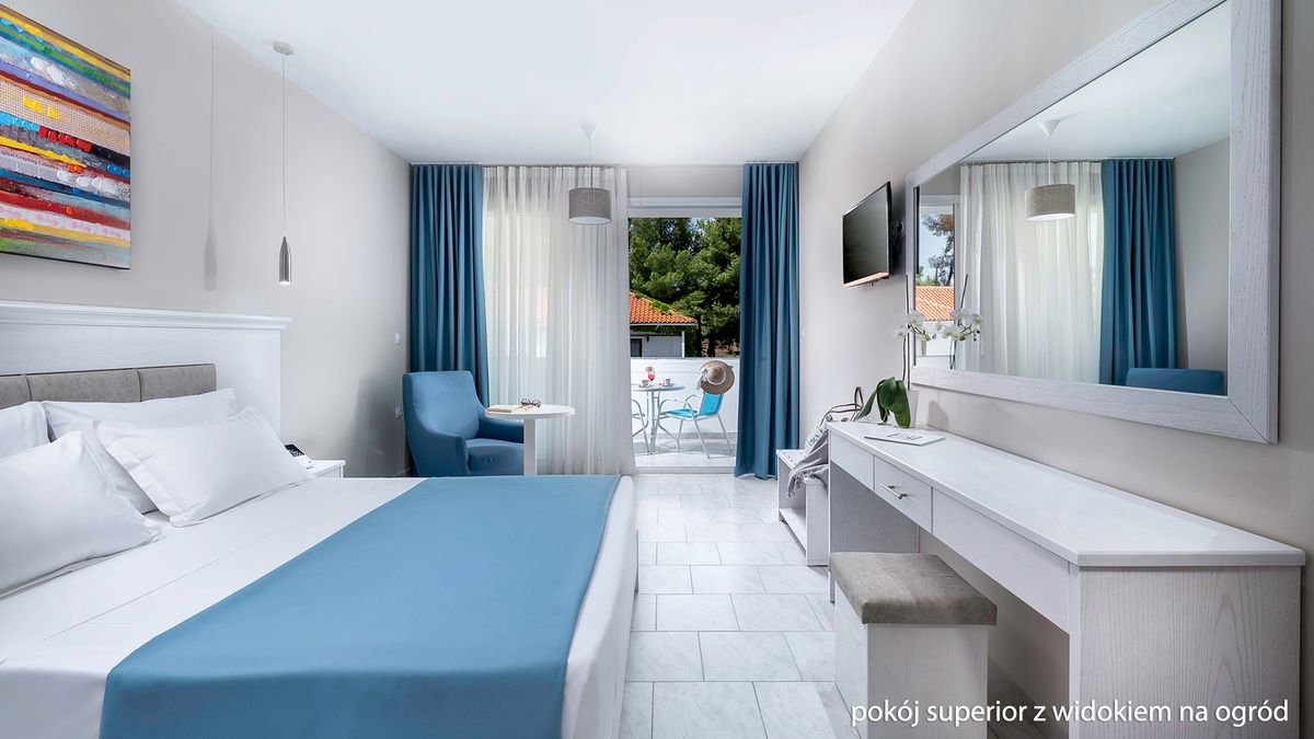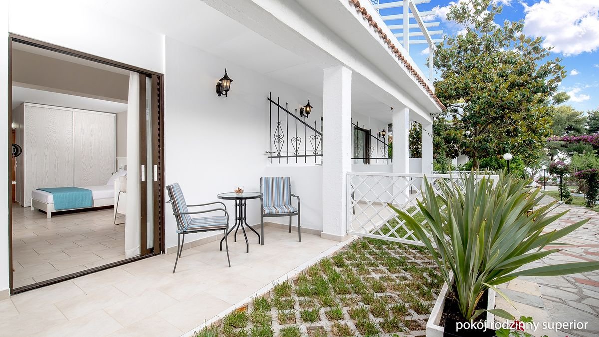 standardowy: 2-os., ok. 23 m², elegancki i wygodny, indywidualnie sterowana klimatyzacja (w terminie: 30.04-10.10), łazienka (wanna, wc; suszarka), telewizja satelitarna, telefon, lodówka; łóżeczko dla dziecka do lat 2 na zamówienie; balkon lub taras (stolik i krzesełka); widok na ogród; standardowy promo: 2-os.; wyposażenie jak w pokoju standardowym; pokoje położone na parterze, w oddalonej części ogrodu; superior z widokiem na ogród: 2-os. (możliwość 1 dostawki – sofa), ok. 28 m²; wyposażenie jak w pokoju standardowym; widok na ogród; pokój superior z widokiem na ogród za dopłatą; rodzinny superior: 2-os. (możliwość 1 dostawki – rozkładana sofa, dla 3 os. dorosłej lub 2 dzieci), ok. 33 m²; wyposażenie jak w pokoju standardowym; pokój rodzinny superior za dopłatą; rodzinny suite: 2-os. (możliwość 2 dostawek – sofy), ok. 45 m², 2 łazienki (jedna z wanną, druga z prysznicem), dwa pomieszczenia; wyposażenie jak w pokoju standardowym; rodzinny suite za dopłatą.