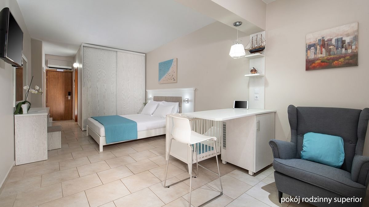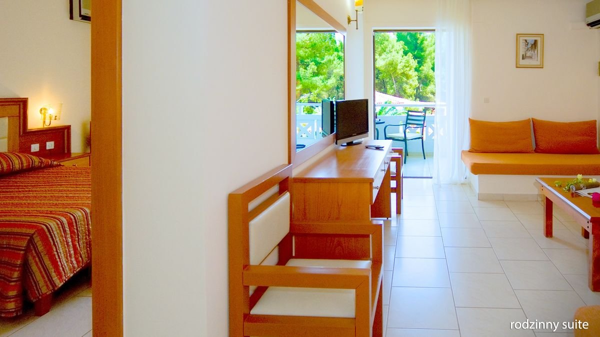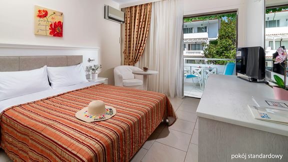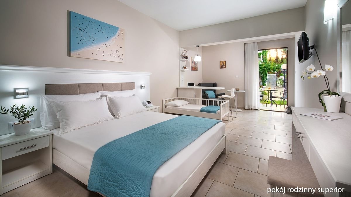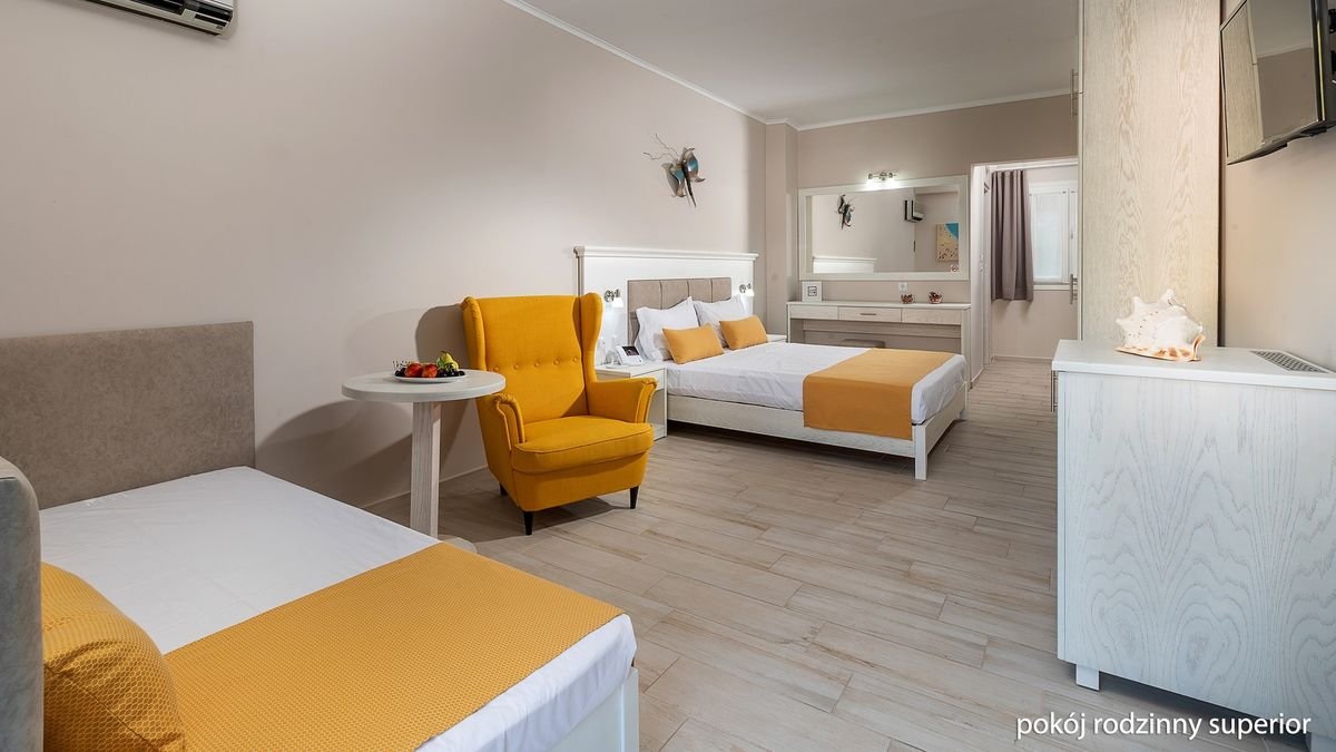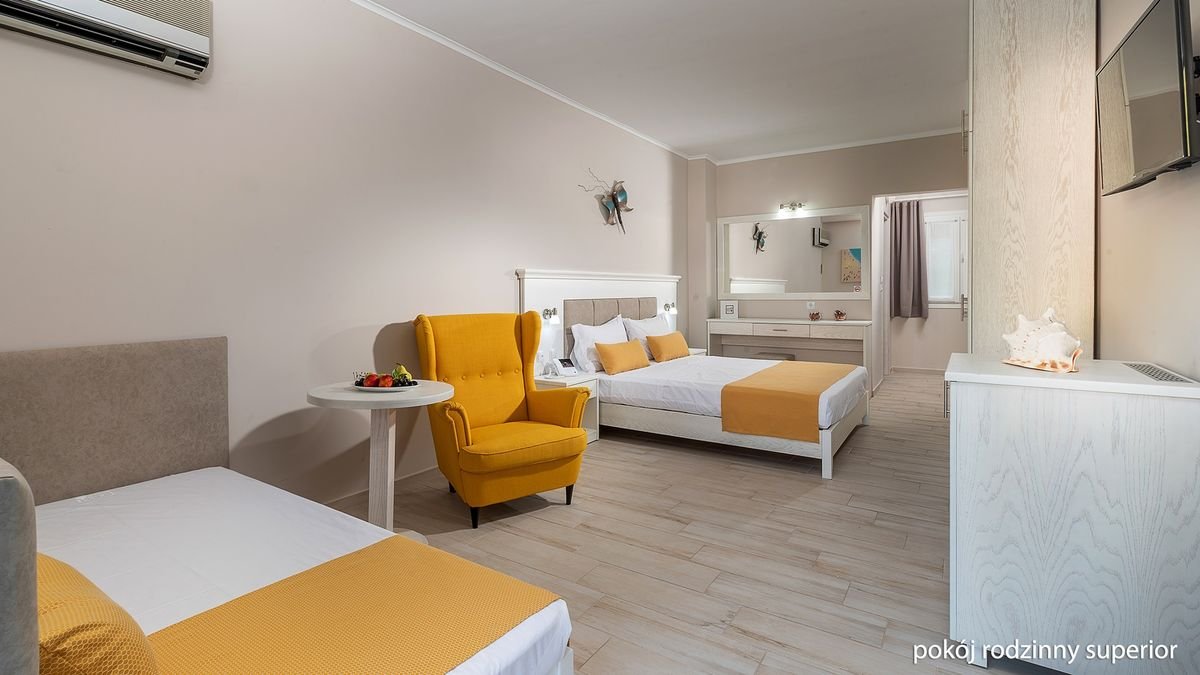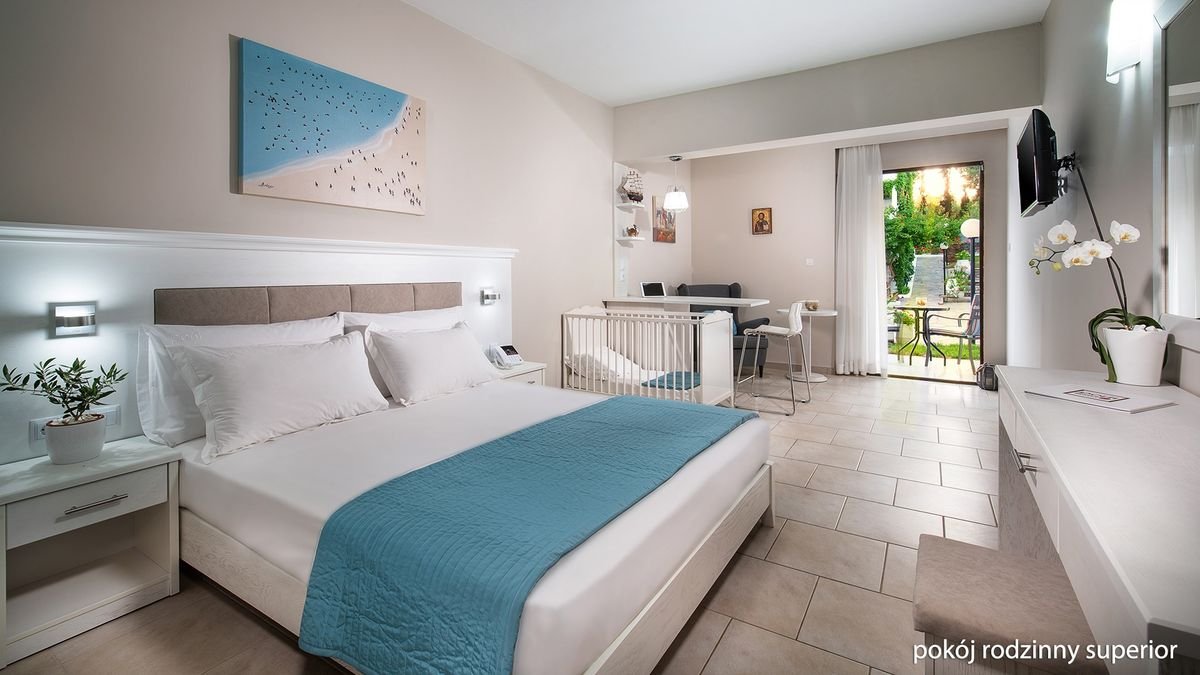 standardowy: 2-os., ok. 23 m², elegancki i wygodny, indywidualnie sterowana klimatyzacja (w terminie: 30.04-10.10), łazienka (wanna, wc; suszarka), telewizja satelitarna, telefon, lodówka; łóżeczko dla dziecka do lat 2 na zamówienie; balkon lub taras (stolik i krzesełka); widok na ogród; standardowy promo: 2-os.; wyposażenie jak w pokoju standardowym; pokoje położone na parterze, w oddalonej części ogrodu; superior z widokiem na ogród: 2-os. (możliwość 1 dostawki – sofa), ok. 28 m²; wyposażenie jak w pokoju standardowym; widok na ogród; pokój superior z widokiem na ogród za dopłatą; rodzinny superior: 2-os. (możliwość 1 dostawki – rozkładana sofa, dla 3 os. dorosłej lub 2 dzieci), ok. 33 m²; wyposażenie jak w pokoju standardowym; pokój rodzinny superior za dopłatą; rodzinny suite: 2-os. (możliwość 2 dostawek – sofy), ok. 45 m², 2 łazienki (jedna z wanną, druga z prysznicem), dwa pomieszczenia; wyposażenie jak w pokoju standardowym; rodzinny suite za dopłatą.