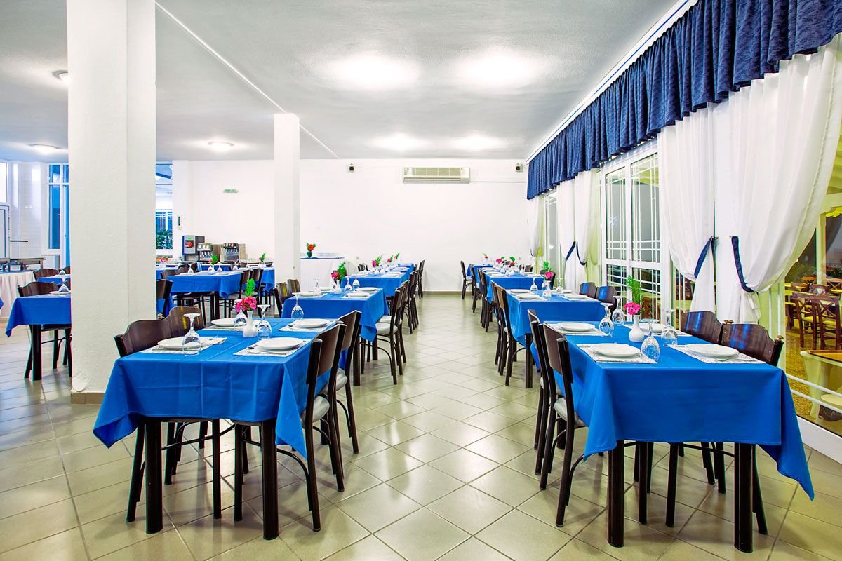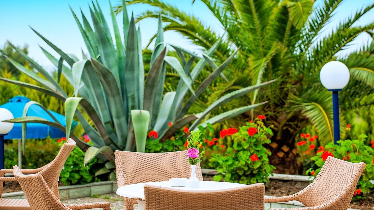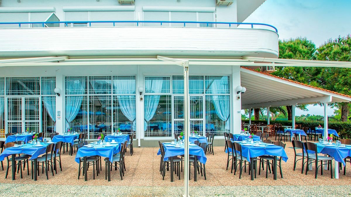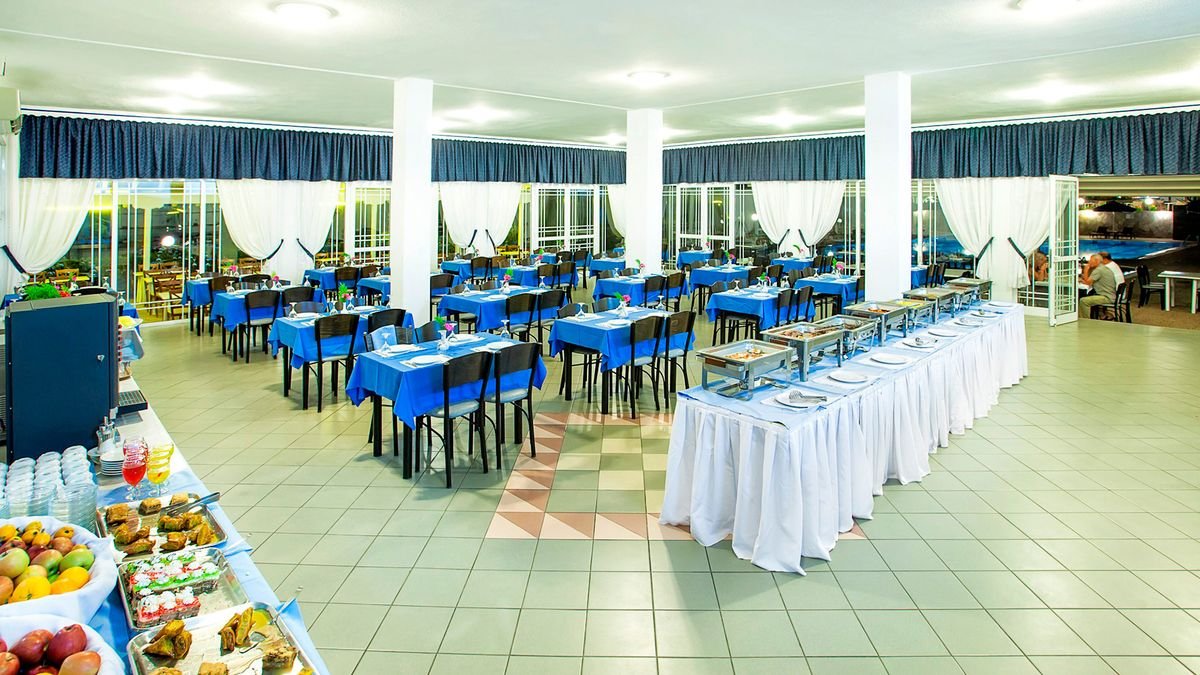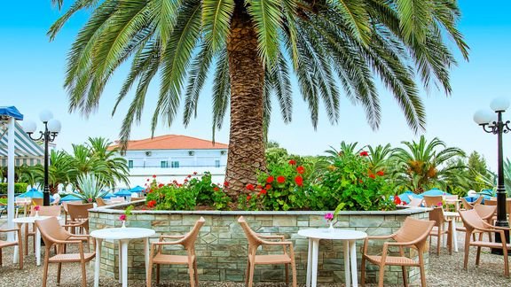 śniadanie (7.00-10.00), obiad (12.30-14.30), kolacja (19.00-21.30) w formie bufetu w restauracji; przekąski w wyznaczonym barze (15.00-17.00); kawa, herbata, ciasto w restauracji (16.00-18.00); napoje bezalkoholowe i lokalne napoje alkoholowe: piwo, ouzo, brandy, wino w barze przy basenie (10.00-23.00); wymagane noszenie opasek all inclusive.