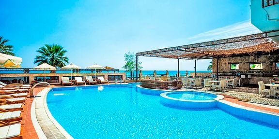 publiczna, piaszczysto-żwirkowa, łagodne zejście do morza, ok. 30 m od hotelu, przejście przez mało ruchliwą drogę, bezpłatne parasole i leżaki, ręczniki za kaucją (ok. 10 EUR/szt.).