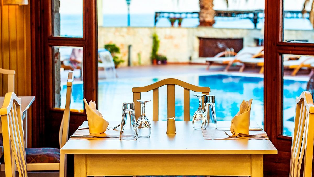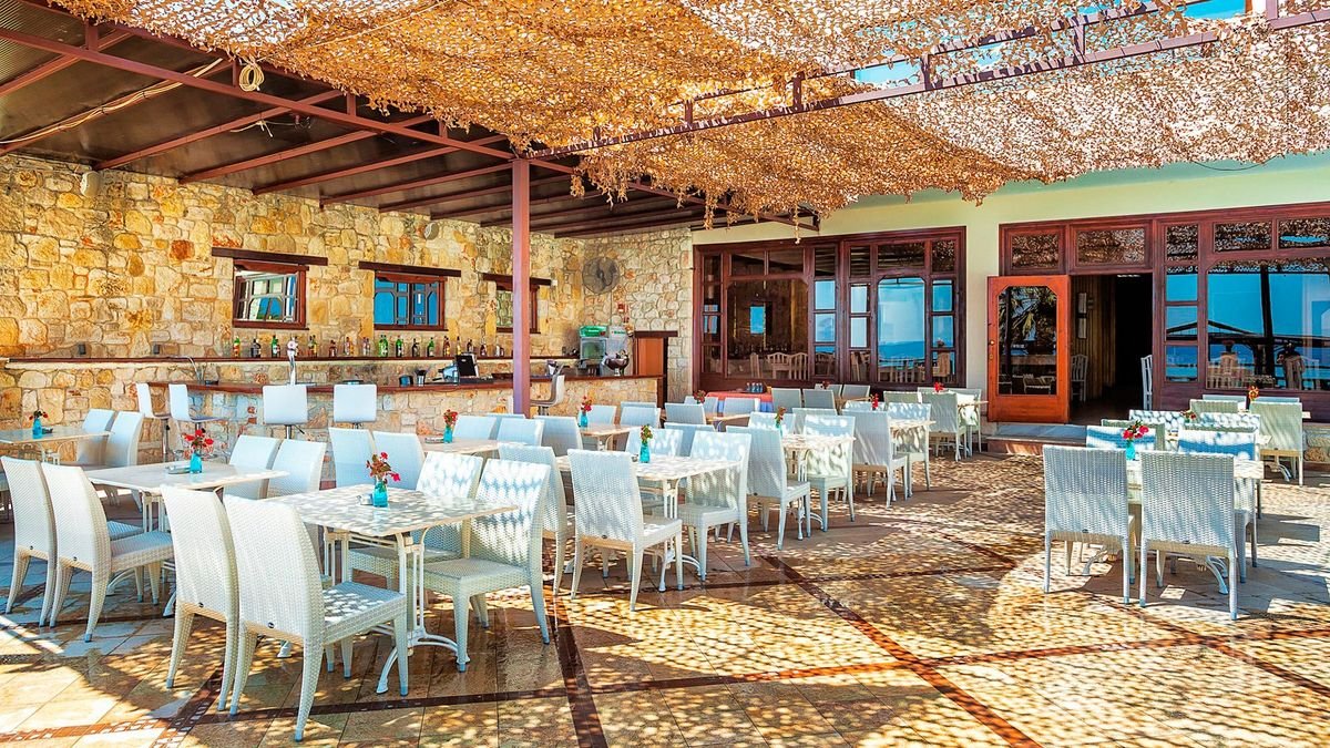 śniadanie (7.00-10.00), obiad (12.30-14.30), kolacja (19.00-21.30) w restauracji głównej; napoje bezalkoholowe i lokalne napoje alkoholowe: piwo, ouzo, brandy, wino w barze (9.00-23.00); wymagane noszenie opasek all inclusive.