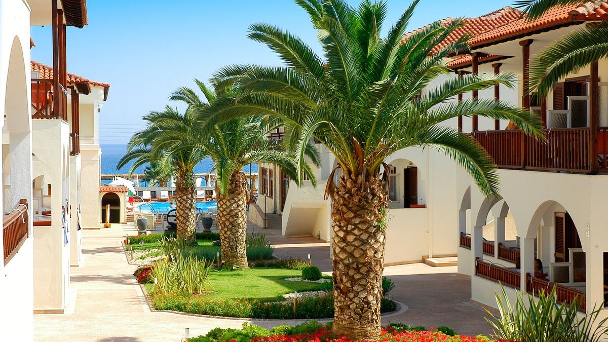czterogwiazdkowy, greckiej kategorii A, zbudowany w 1961 r., odnowiony w 2008 i 2016 r., 72 pokoje, 8 budynków, przestronne i eleganckie lobby, całodobowa recepcja, restauracja główna – dania w formie bufetu, kuchnia grecka i śródziemnomorska, dostępne foteliki i menu dla dzieci, dania wegetariańskie, dieta bezglutenowa na zamówienie, podczas kolacji wymagany strój formalny (panowie – długie spodnie), bistro przy plaży – à la carte (czynne: lipiec-sierpień), bar przy basenie; taras z widokiem na ogród i basen, bezpłatny internet bezprzewodowy w lobby; akceptowane karty kredytowe: Visa, MasterCard, American Express.