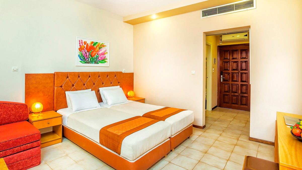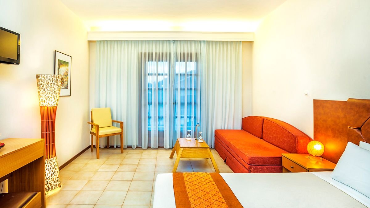 superior: 2-os. (możliwość 1 lub 2 dostawek), ok. 30 m², zadbany, praktycznie urządzony, indywidualnie sterowana klimatyzacja, łazienka (wanna, wc; suszarka), telewizja satelitarna, polski program, telefon, lodówka, sejf; bezpłatne łóżeczko dla dziecka do 2 lat na zamówienie przed przyjazdem; balkon (stolik i krzesełka), widok na ogród.