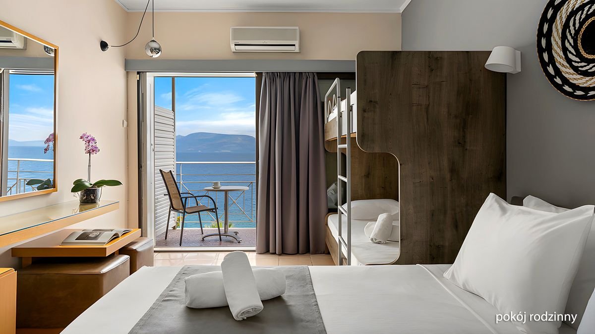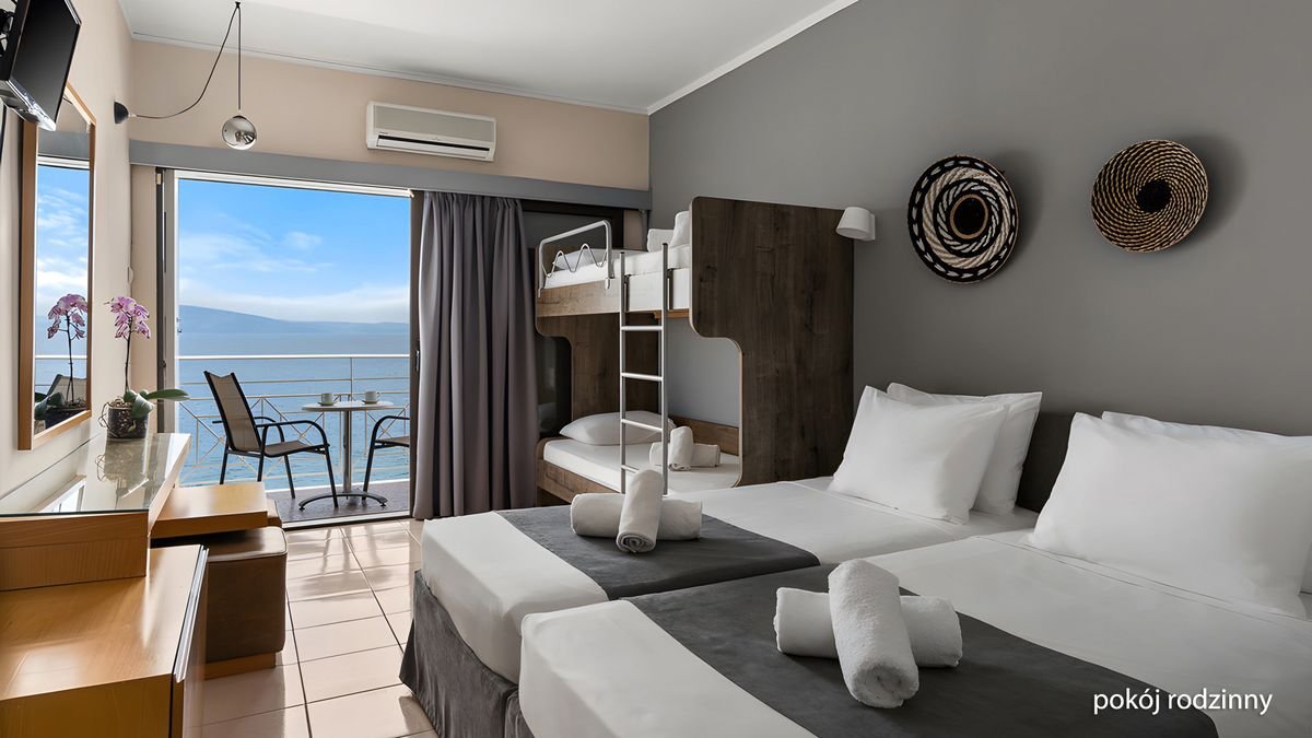 Zapraszamy do świeżo odnowionego hotelu położonego pośród egzotycznej roślinności, bezpośrednio przy plaży, na której możesz leniuchować przez cały dzień. Doskonały niezależnie czy szukasz miejsca na urlop ze znajomymi czy na rodzinne wakacje, na miejscu wiele atrakcji dla dorosłych i dzieci – do dyspozycji basen i brodzik, miniklub, plac zabaw, kort tenisowy czy boisko do koszykówki, tu nie ma czasu na nudę! Wszystkie pokoje są komfortowo wyposażone i posiadają balkon, z którego możesz podziwiać piękny widok na morze, a jeśli dołożymy do tego smaczną kuchnie, miły i pomocy personel, otrzymamy doskonały przepis na udane, greckie wakacje!