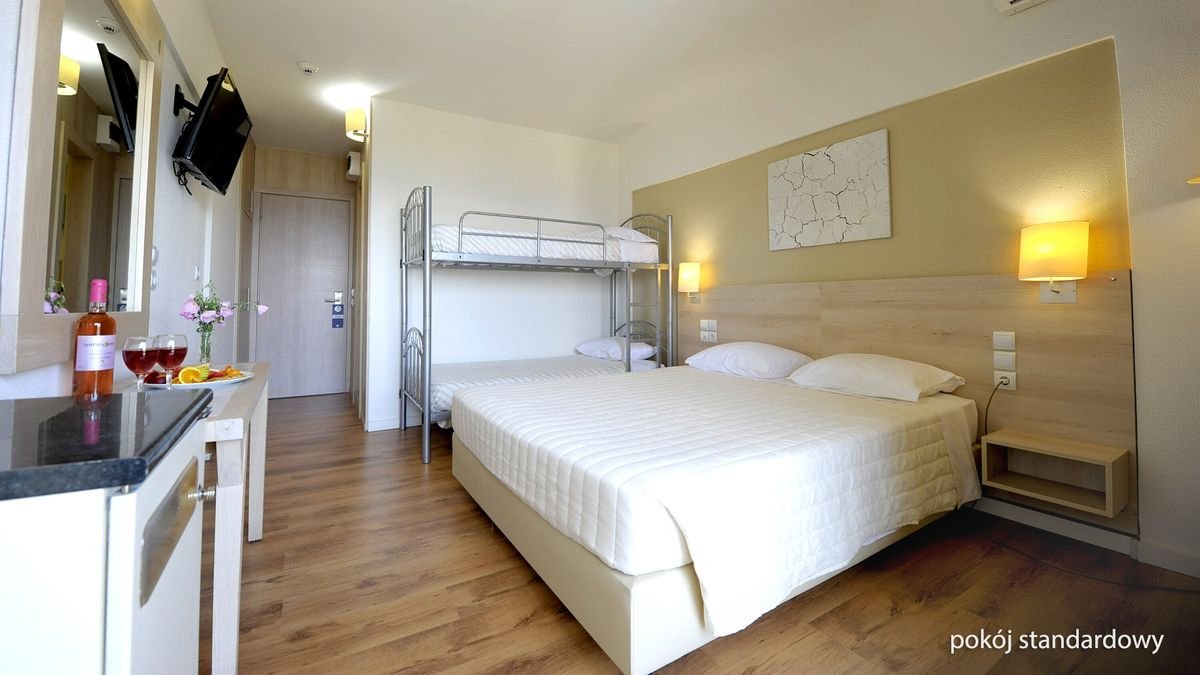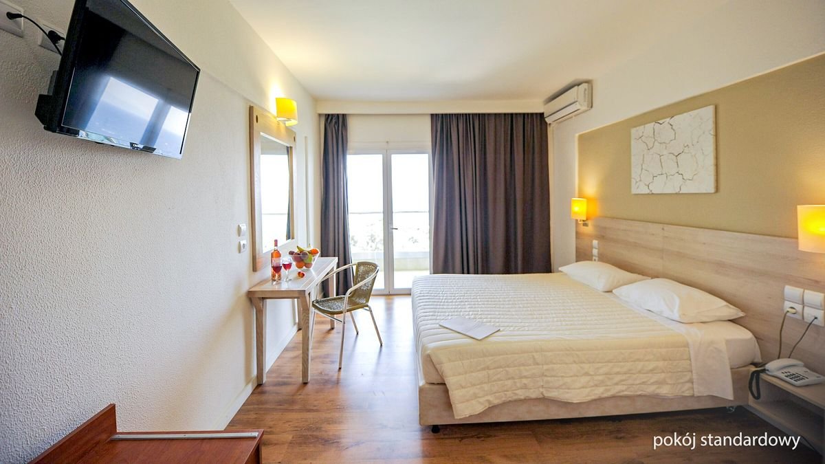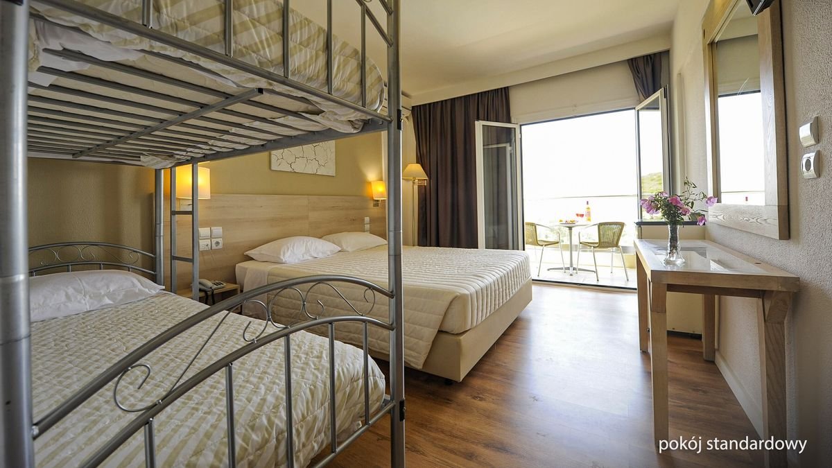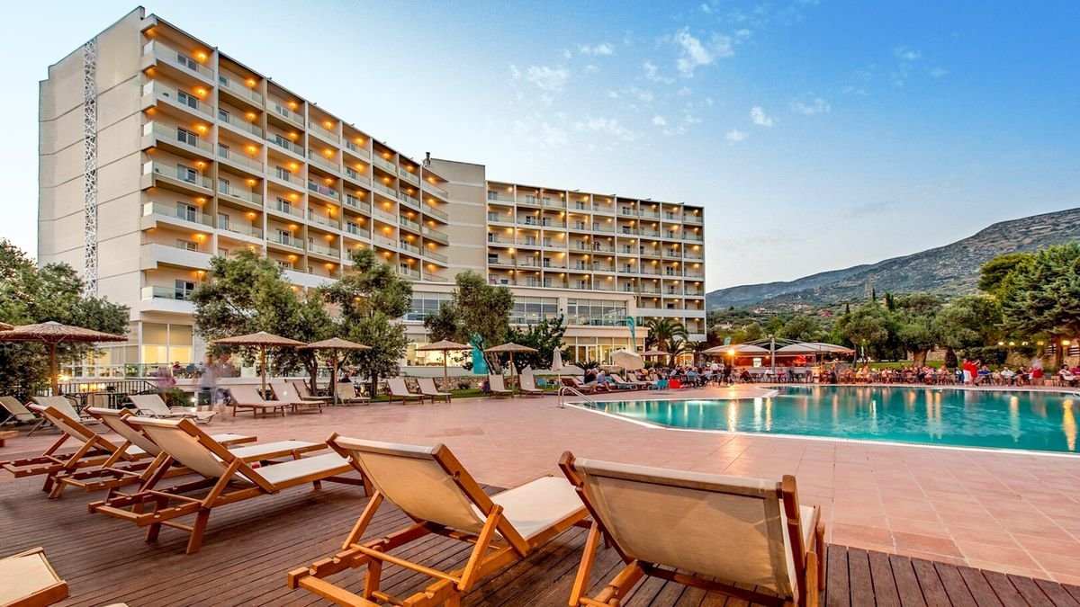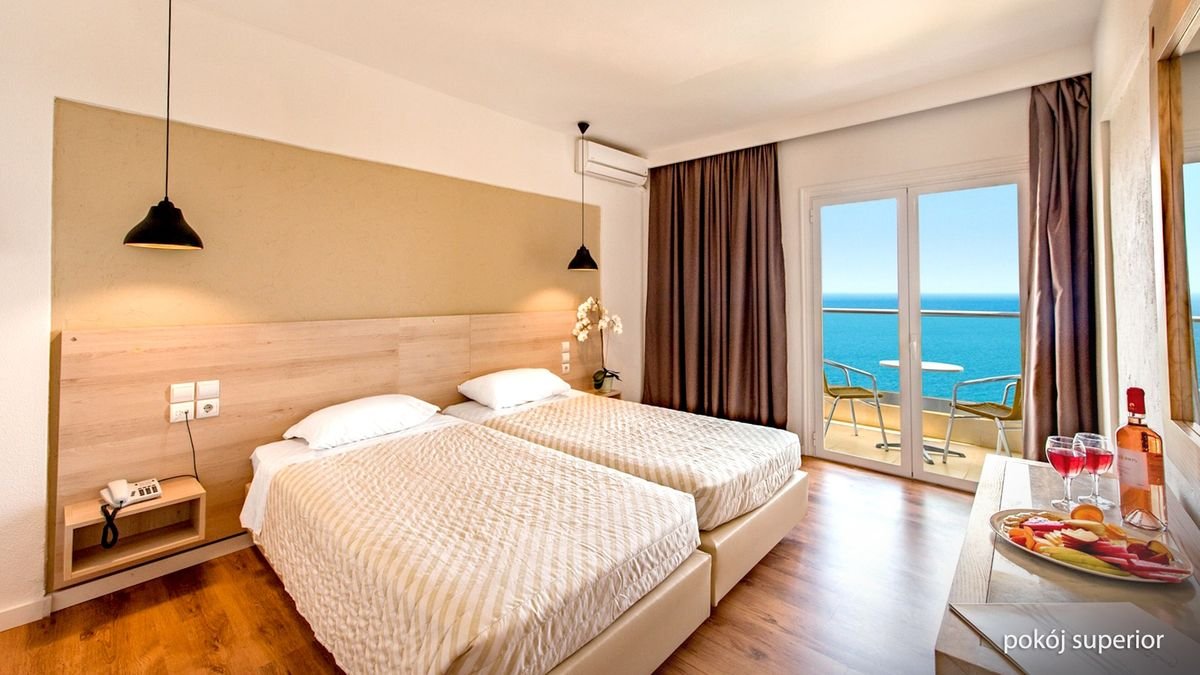 Elegancki hotel, położony w pięknym otoczeniu oraz blisko plaży – to wyjątkowe miejsce na beztroskie wakacje. Do dyspozycji Gości przygotowano przestronne i funkcjonalnie wyposażone pokoje, w których można doskonale wypocząć oraz restaurację i 3 bary, serwujące orzeźwiające, kolorowe koktajle. Prawdziwy relaks czeka podczas opalania przy basenie lub w ogrodzie, gdy w tym czasie nieco młodsi spędzą miło czas na placu zabaw. Miłośnicy aktywnego wypoczynku mogą wybrać się na spacer, by odkryć wspaniałą okolicę lub zostać w hotelu i spróbować swoich sił w grach zespołowych, tenisie stołowym lub rzutkach. Odwiedź cudowną Grecję, która zachwyca pięknymi krajobrazami i ciekawą historią, a Twój urlop będzie niezapomniany!