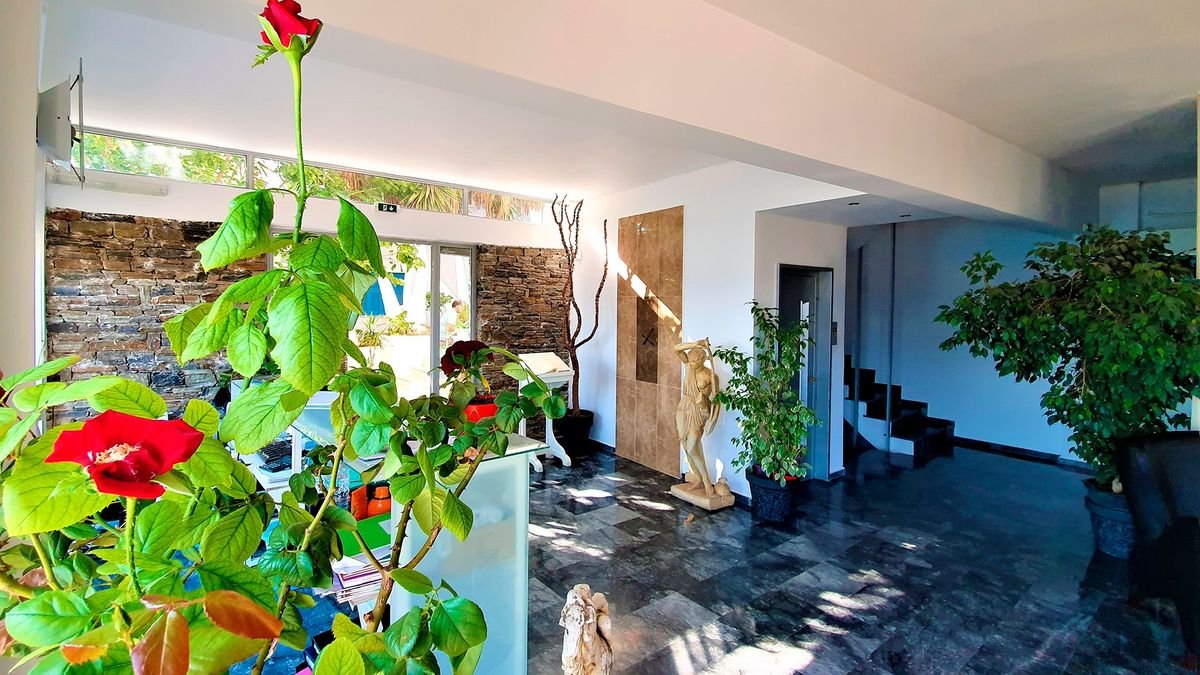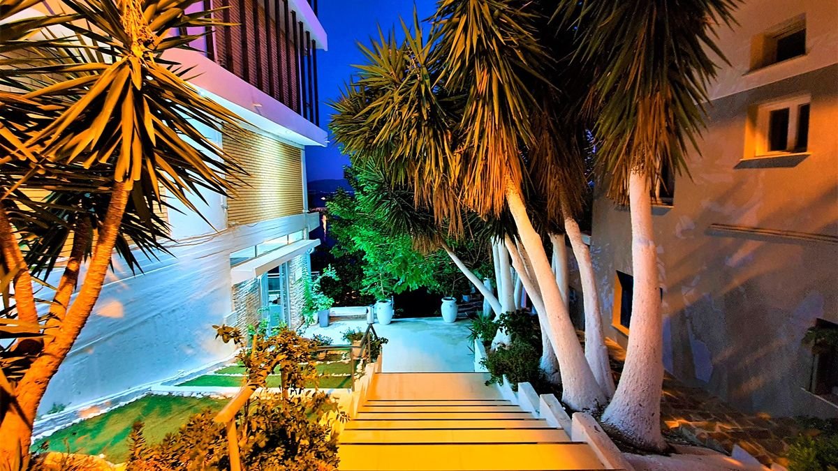 czterogwiazdkowy, zbudowany w 1979 r., odnowiony w 2015 r., 43 pokoje, 5 pięter, winda, mały hol, całodobowa recepcja, restauracja Flisvos - dania w formie bufetu, kuchnia grecka i międzynarodowa, dostępne foteliki dla dzieci, dania wegetariańskie, dieta bezglutenowa, bar przy basenie; room-service; taras z widokiem na morze, ogród (ok. 500 m2), bezpłatny internet bezprzewodowy; za opłatą: pralnia; akceptowane zwierzęta domowe od 5 kg (płatne: ok. 10 EUR/dzień); akceptowane karty kredytowe: Visa, MasterCard.