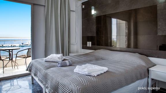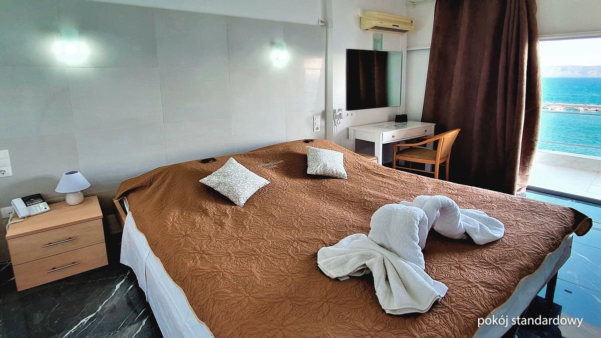 standardowy: 2-os. (możliwość 1 dostawki), ok. 14 m2, indywidualnie sterowana klimatyzacja, łazienka (wanna lub prysznic, wc; suszarka), internet bezprzewodowy, telewizor, telefon, lodówka, sejf (płatny: ok. 12 EUR/tydz.); łóżeczko dla dziecka do 2 lat na zamówienie przed przyjazdem (płatne: ok. 10 EUR/doba); balkon (stolik i krzesełka), widok na morze; ; superior: 2-os. (możliwość 1 dostawki), ok. 20 m², wyposażenie jak w pokoju standardowym, widok na morze; pokój superior za dopłatą.