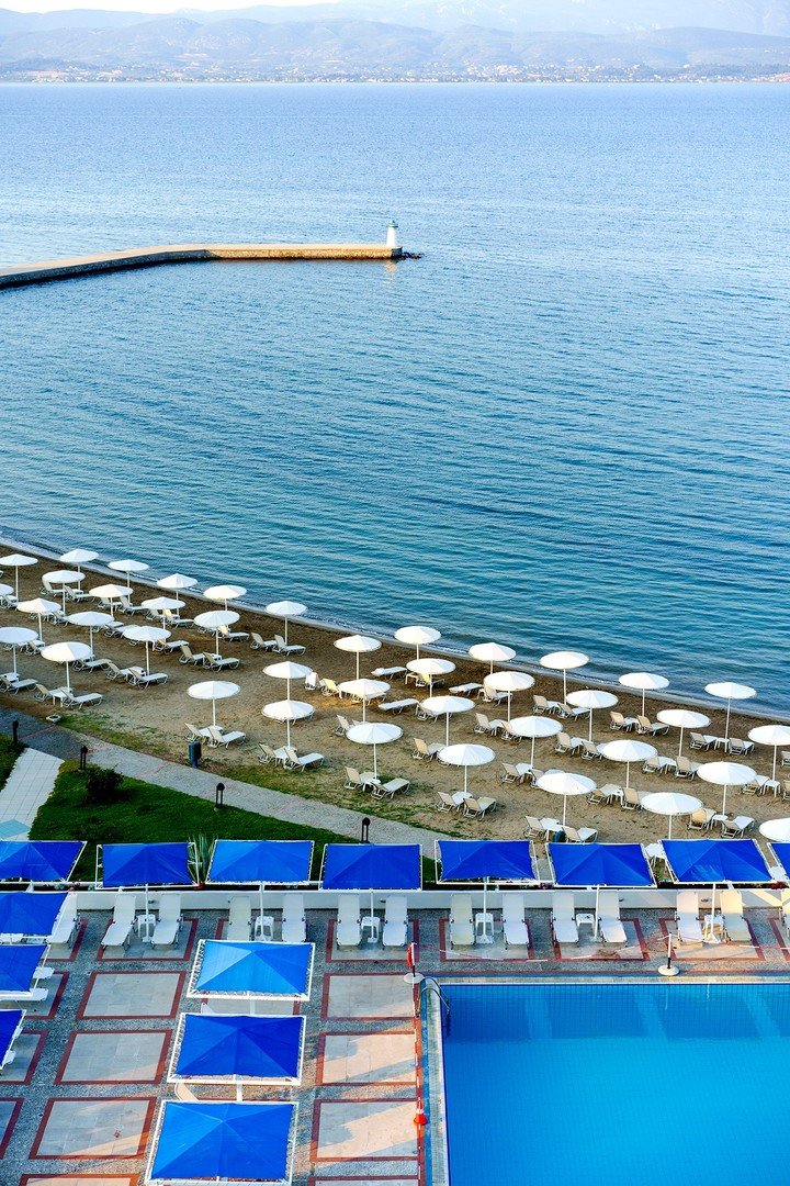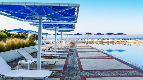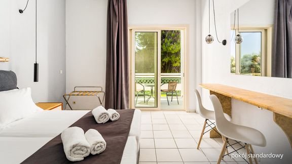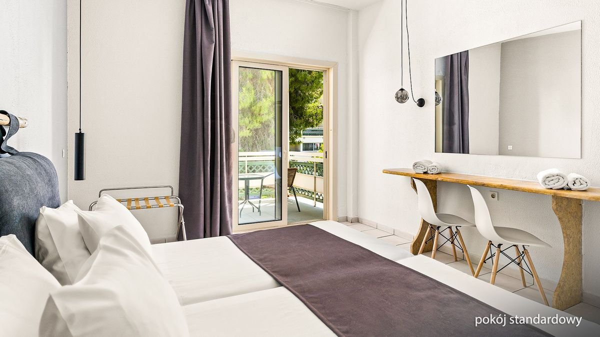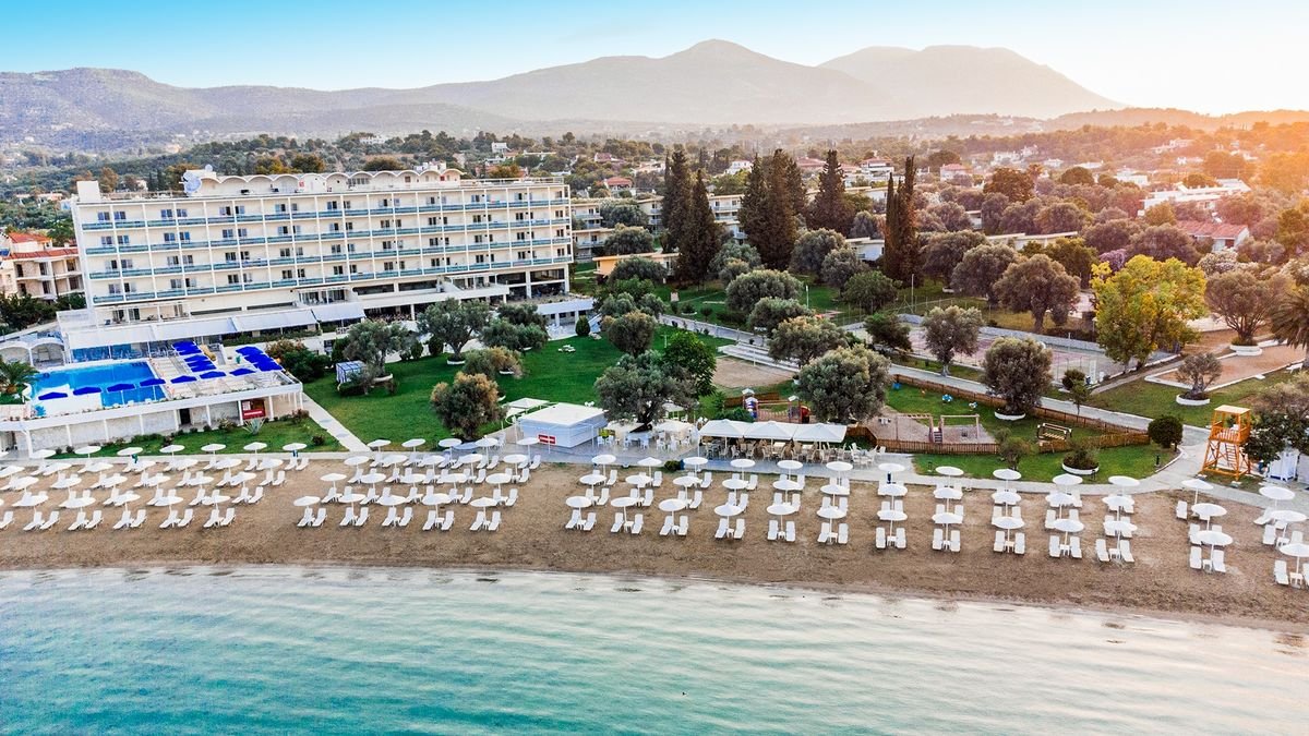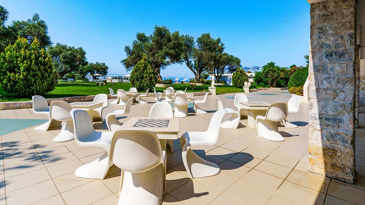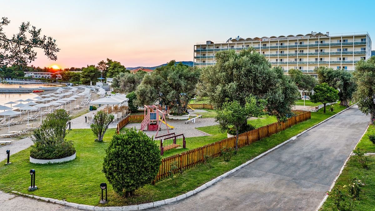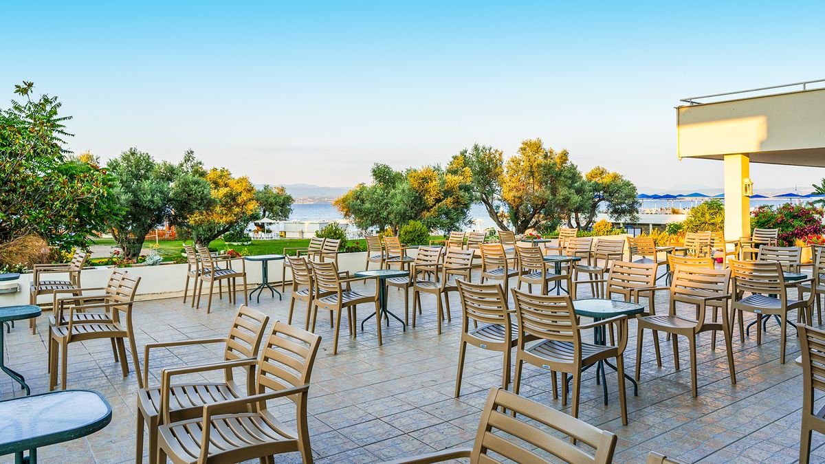 Świetnie położony i elegancki. Piękny hotelowy ogród z palmami, drzewkami oliwnymi i zadbanymi trawnikami prowadzi wprost na plażę. Z tarasu przy basenie podziwiać można cudowny, wyspiarski pejzaż, jak żywcem wzięty z wakacyjnej widokówki. Profesjonalnie prowadzony, z zawsze dyspozycyjną, wielojęzyczną obsługą, gwarantuje udane greckie wakacje w prawdziwie czterogwiazdkowym standardzie.