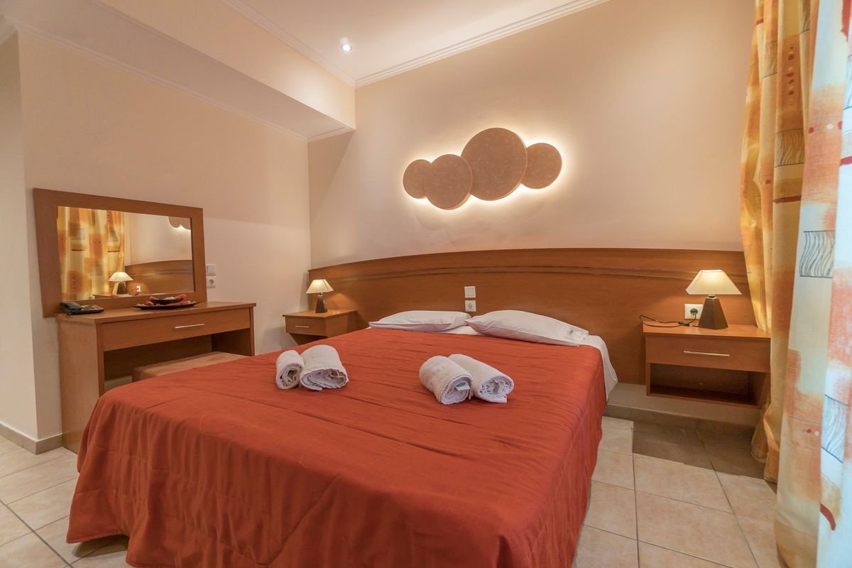 standardowy: 2-os., ok. 25 m2, klimatyzowany, łazienka (prysznic, wc; suszarka), internet bezprzewodowy, telewizja satelitarna, telefon, mała lodówka; bezpłatne łóżeczko dla dziecka do 2 lat na zamówienie przed przyjazdem; balkon (stolik i krzesełka), widok na morze; suite: 2-os. (możliwość 1 dostawki), ok. 55 m2, pokój dzienny z optycznie wydzieloną sypialnią, wyposażenie jak w pokoju standardowym; balkon (stolik i krzesełka), widok na morze; rodzinny: 2-os. (możliwość 1 dostawki dla 2 dzieci – łóżko piętrowe), ok. 30 m2, wyposażenie jak w pokoju standardowym; balkon (stolik i krzesełka), widok na morze; pokoje: suite i rodzinny za dopłatą.