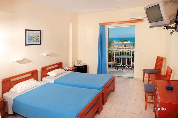 dla maks. 4 os., ok. 28 m², zadbane, indywidualnie sterowana klimatyzacja, łóżko małżeńskie lub 2 pojedyncze i 2-os. sofa, łazienka (prysznic, wc; suszarka), telewizja satelitarna, polski program, telefon, lodówka, czajnik i filiżanki na życzenie; sejf (ok. 1,5 EUR/dzień + kaucja 10 EUR); bezpłatne łóżeczko dla dziecka do 2 lat na zamówienie przed przyjazdem; balkon lub taras (stolik i krzesełka); widok na morze, basen lub ogród.