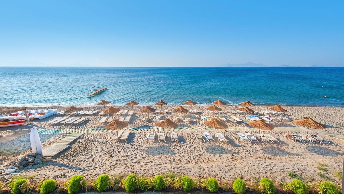 hotelowa, piaszczysto-żwirkowa, łagodne zejście do morza, bezpośrednio przy hotelu (różna odległość w zależności od zakwaterowania), przejście przez ogród, bezpłatne parasole i leżaki, ręczniki za kaucją (ok. 10 EUR).