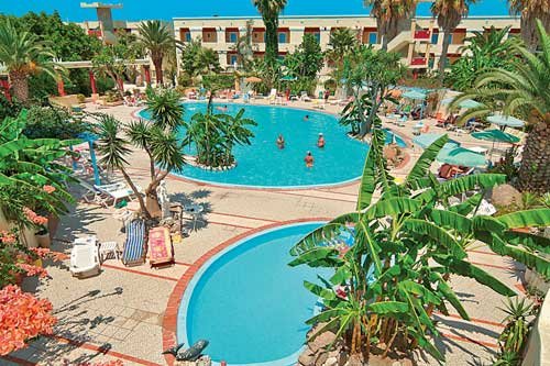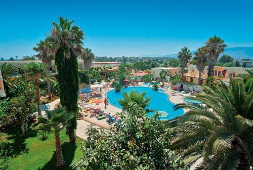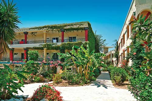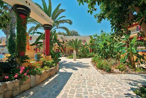 Wyjątkowo oryginalna architektura i wystrój hotelu nawiązują do słynnego pałacu Minosa w Knossos. Kolumnady, intensywne barwy i antyczne akcenty dekoracji wprowadzają pogodny nastrój i podkreślają lokalny klimat. Hotelowe budynki, ładny basen, staw z łabędziami i flamingiem dosłownie toną w egzotycznej zieleni z palmami i drzewami bananowymi. Położony w spokojnym miejscu, blisko plaży jest idealny na beztroskie rodzinne wakacje. Na amatorów nocnych rozrywek czeka stolica wyspy, dostępna na piechotę lub wygodnym połączeniem autobusowym.