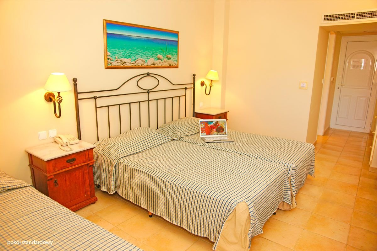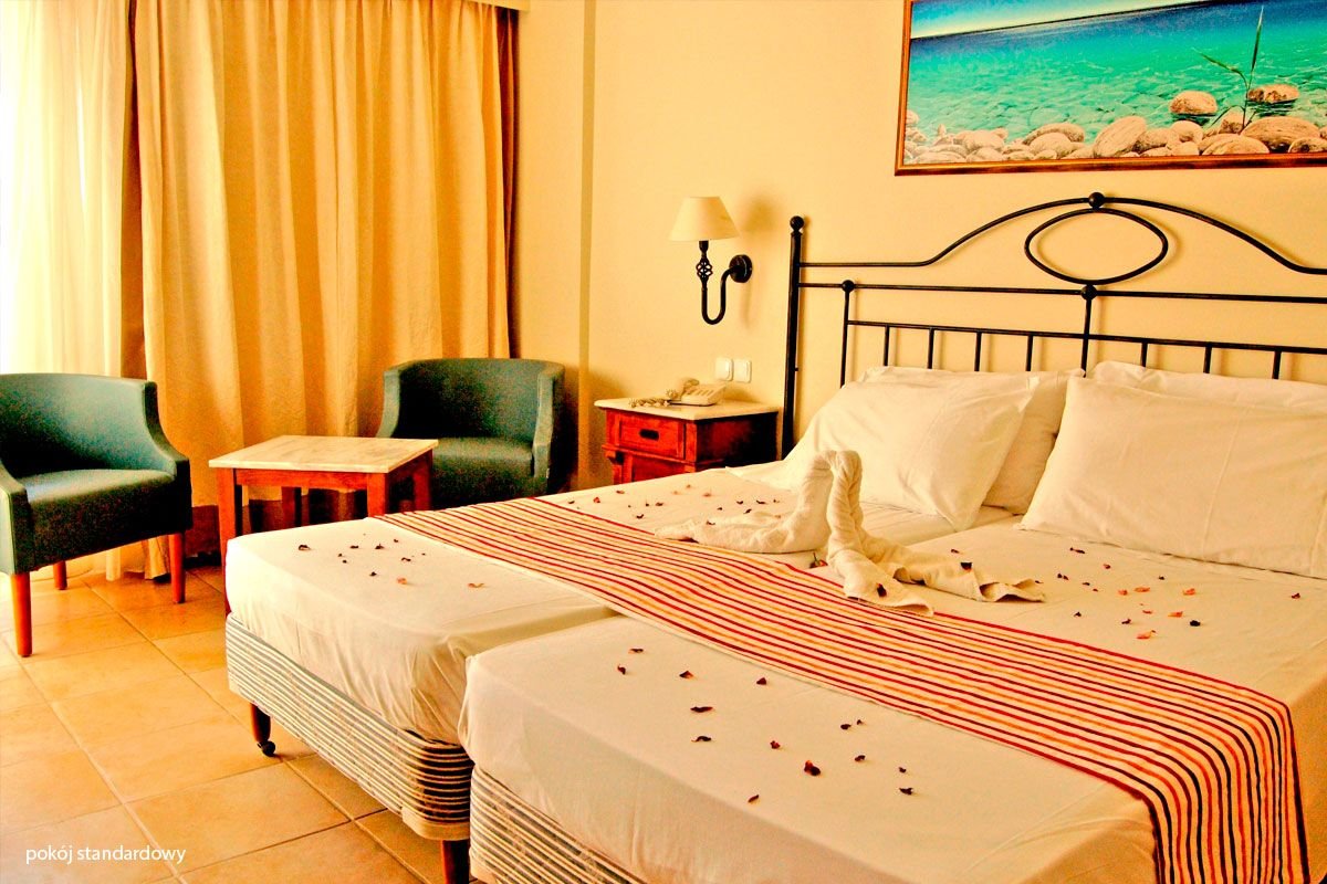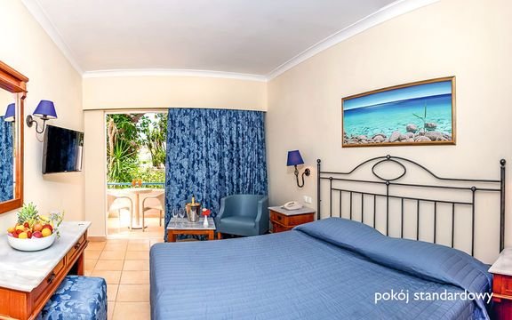 standardowy: 2-os. (możliwość 1 lub 2 dostawek – łóżko piętrowe), ok. 18-22 m², klimatyzowany, łazienka (wanna, wc; suszarka), telewizja satelitarna, telefon, lodówka, sejf (płatny: 15 EUR/tydz.); bezpłatne łóżeczko dla dziecka do 2 lat na zamówienie przed przyjazdem; balkon (stolik i krzesełka), widok na ogród lub basen; pokój z dwoma dostawkami za dopłatą.