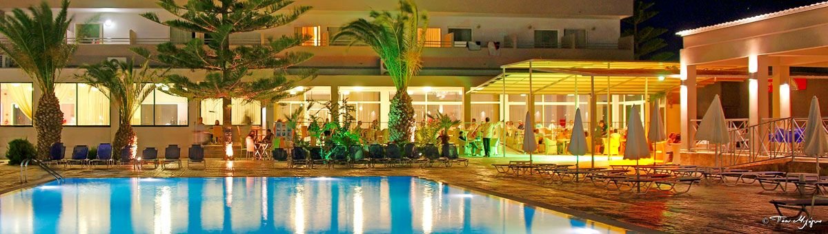 czterogwiazdkowy, zbudowany w 1996 r., planowany całkowity remont zimą 2018/2019, 108 pokoi, budynek główny i 6 bocznych budynków, 1-2 piętra, lobby, całodobowa recepcja, restauracja Pearl – dania w formie bufetu, kuchnia międzynarodowa, dostępne foteliki dla dzieci, Posaidon – bar w lobby, Ocean – bar przy basenie, minimarket, taras z widokiem na basen, piękny zagospodarowany ogród; za opłatą: internet bezprzewodowy w lobby, punkt internetowy (ok. 6 EUR/godz.); akceptowane karty kredytowe: Visa, MasterCard.