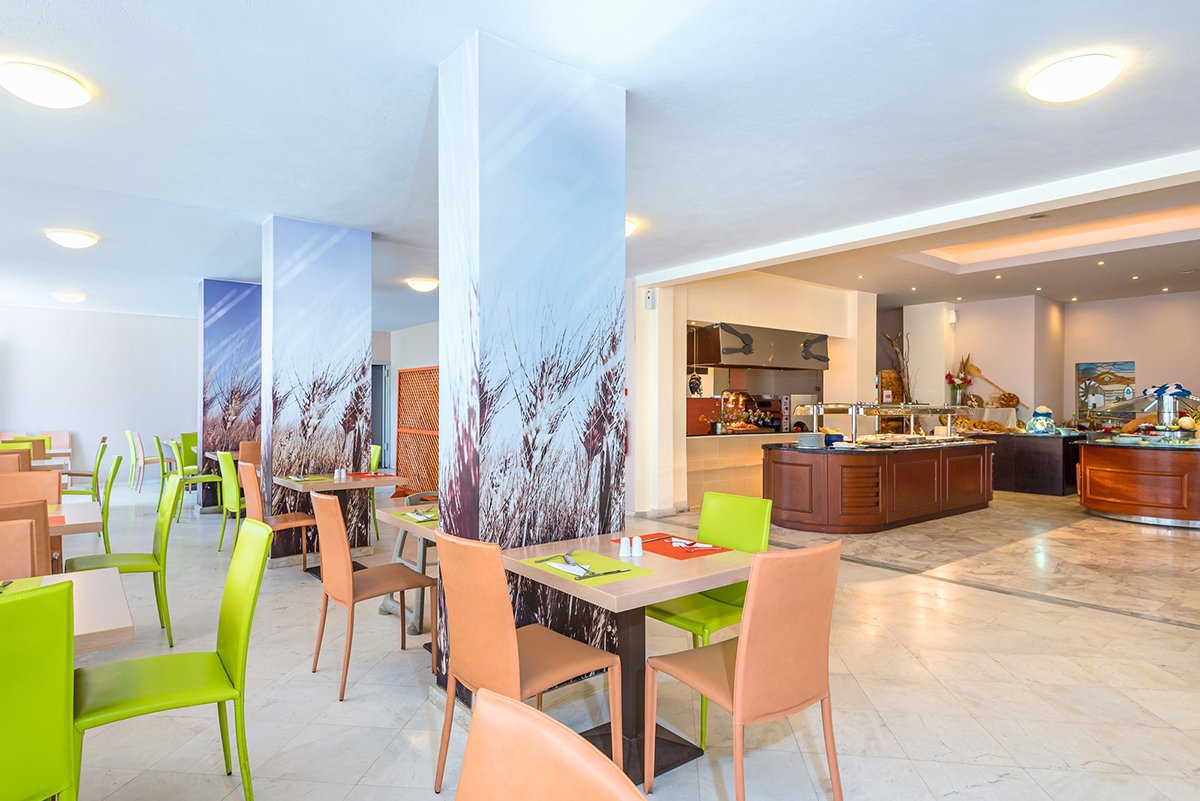 śniadanie (7.30-10.00), obiad (12.30-14.30), kolacja (19.00-21.30) w formie bufetu w restauracji głównej; przekąski w barze przy basenie (11.00-12.00 i 14.30-16.00); podwieczorek: kawa i słodycze (16.00-17.00), lody (14.00-16.00) w barze przy basenie; lokalne napoje bezalkoholowe i alkoholowe w barach (10.00-23.00); wymagane noszenie opasek all inclusive.