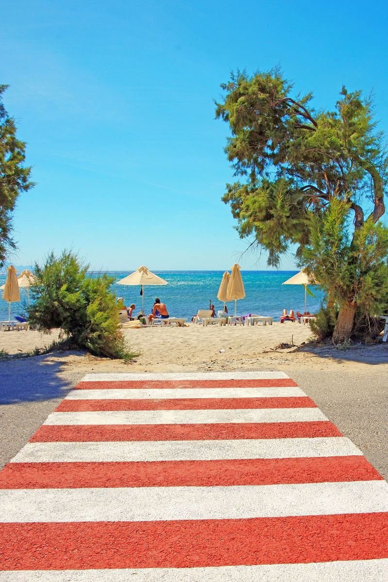 publiczna, piaszczysta z małymi kamykami, łagodne zejście do morza, w drugiej linii brzegowej, ok. 200 m od hotelu, przejście przez drogę i zejście schodami, płatne parasole i leżaki (ok. 5 EUR/komplet).